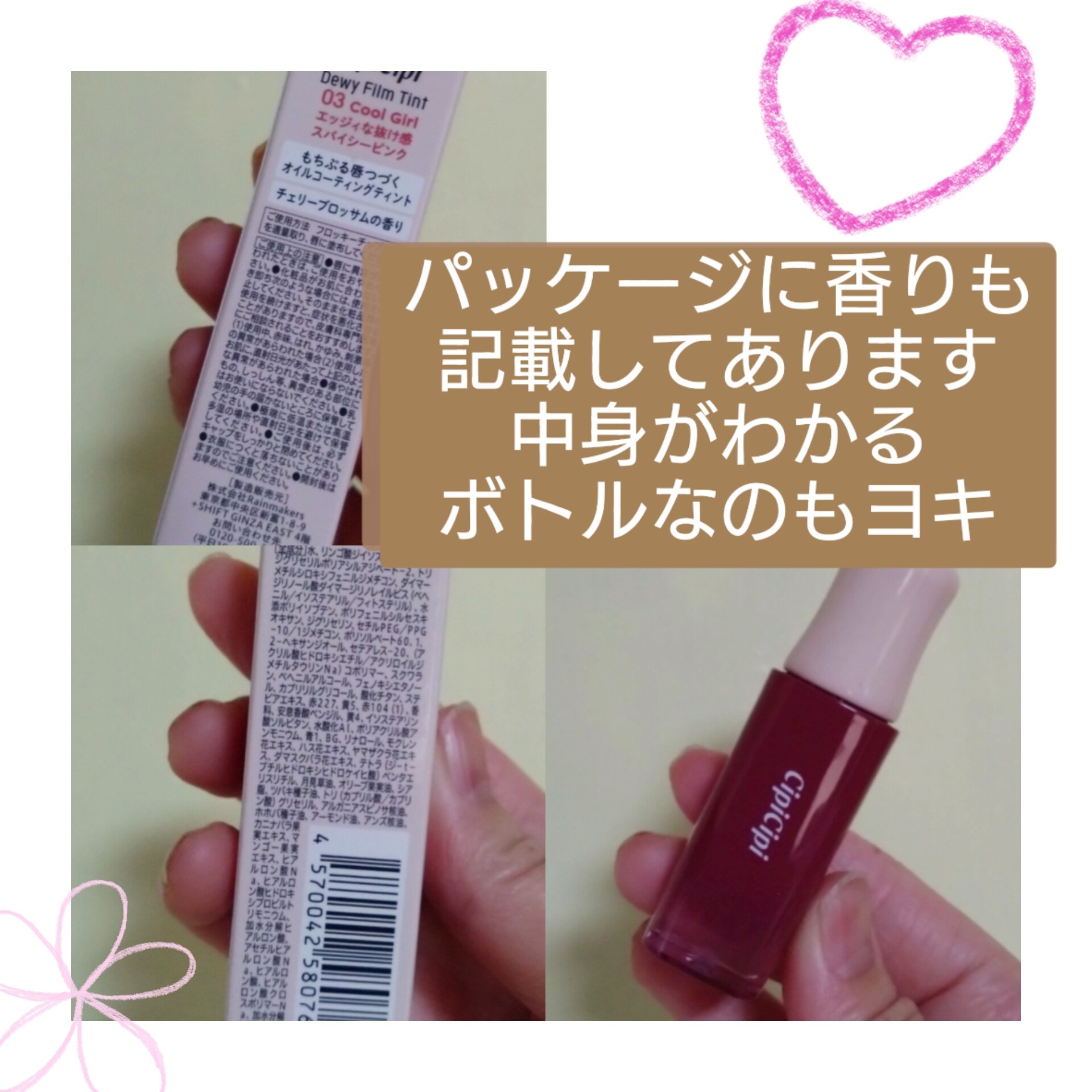 ティント力◎ 保湿力○ 瑞々しくベタつかないのでティント初心者さんにも🔰 カラー03はブルベ夏冬さんに✨ むっちりつやんとした唇にしてくれてとっても可愛いんだけど…… とにかく香り強い😇 チェリーブロッサムの香りで自分は苦手な香りでした💦 韓国ティントより香り強いです。 食事予定がある時、体調によっては無理だなぁと🥲 食事の邪魔になるほどの香りです(ちなみに自分は香りに敏感なほうです) 香料に敏感な人は注意な商品となってます⚠️ テスターだと香り飛んでた為か分からなかったのが悔しいです😇せっかくテスター試したのに!笑 香りの件が無ければ★5でした。 せめてもう少し微香にしてくれれば…と思いました💦