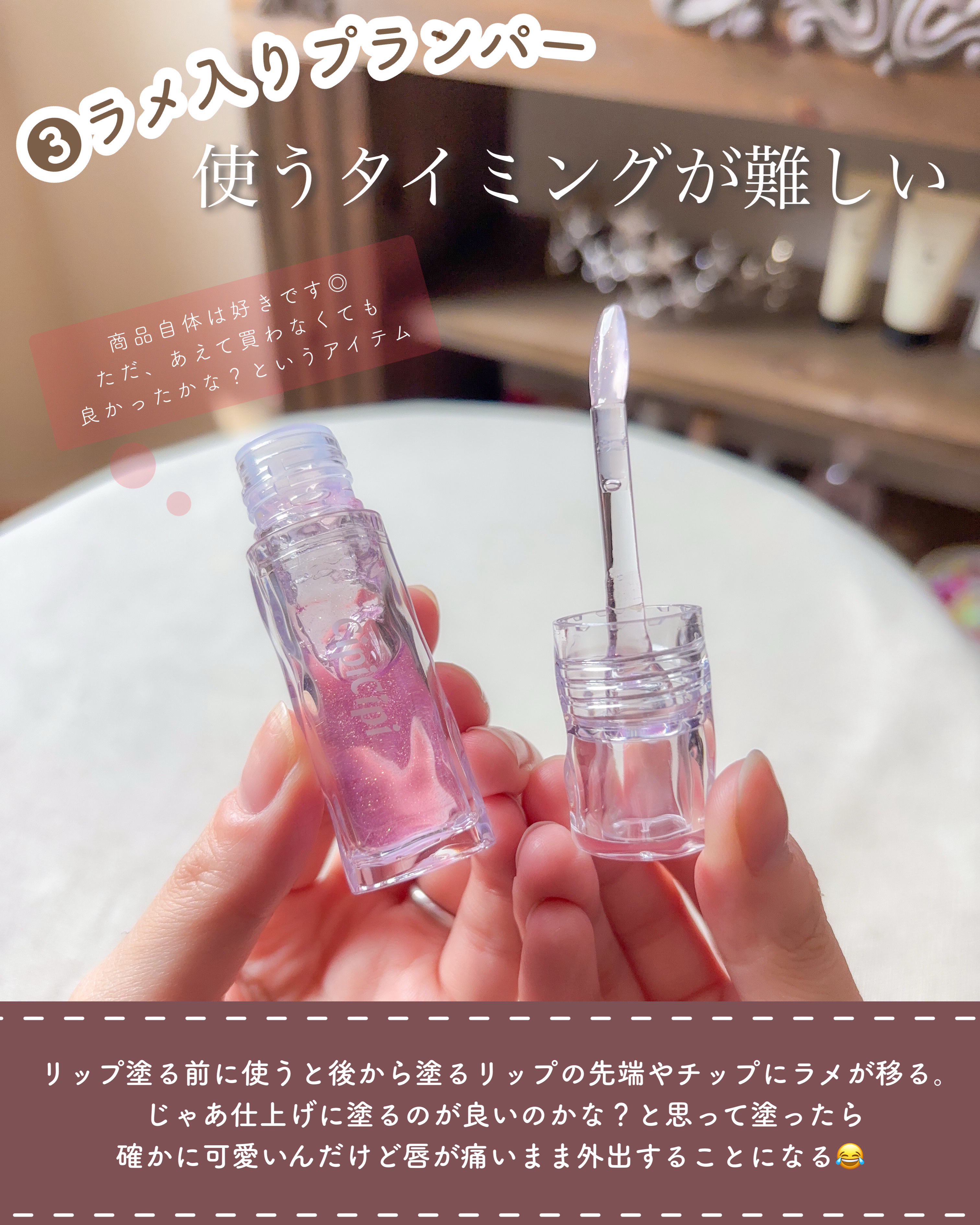 【使った商品】CipiCipiガラスプランパー01はちみつピンク【商品の特徴】すごく甘い香りがする。ピンクのラメが入ってます!【使用感】ちょっとピリピリする。【良いところ】これをひと塗りするだけであざとくて可愛いちゅるちゅるな唇が完成します!...
