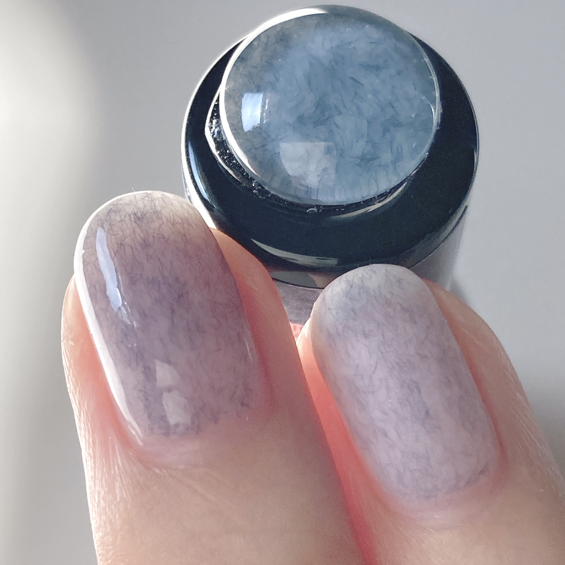 細かい繊維で重ね塗りすると濃くなり、グレーにも見えて可愛い ブルーのネイルをすると浮いてきてしまい自分では合わないと思ってしまうのですが、ベースがシアーブルーなので使用しやすく可愛くて気に入ってます🫐