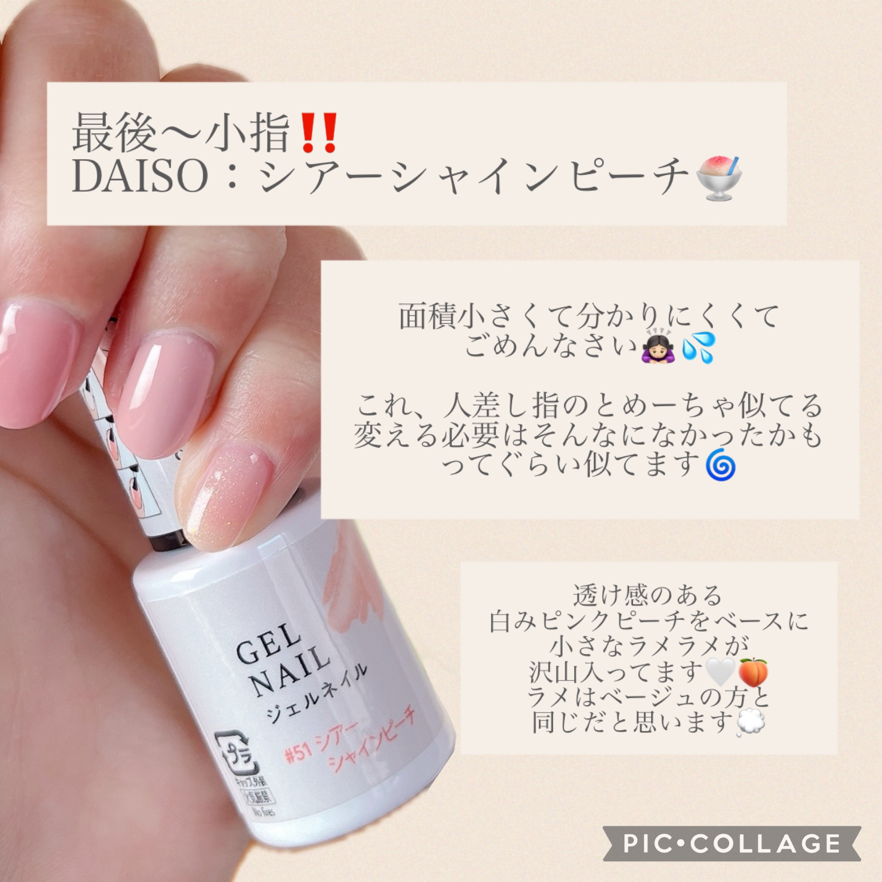 結構いい感じに出来たので嬉しい〜💖 たくさん色増えてきているので 理想の色とも出会いやすくなりました🫶 DAISO:シアーシャインベージュ🩰 透け感のある コーラルピーチベージュをベースに 小さなラメラメが 沢山入っていて可愛い🍑 透け感+ラメは 色ムラに無縁なところも好き🫶 透けないのに透け感がある、 不思議な色🤨 重たくなくて軽い色味です(伝わるかな) コーラルなピンク❕ さっきのセリアのと比べて、 透け感が全く感じられない 重めの色味してます☝️ ザ・ミルクピンク🍼🎀 透け感のある 白みピンクピーチをベースに 小さなラメラメが 沢山入ってます🤍🍑 ラメはベージュの方と 同じだと思います💭