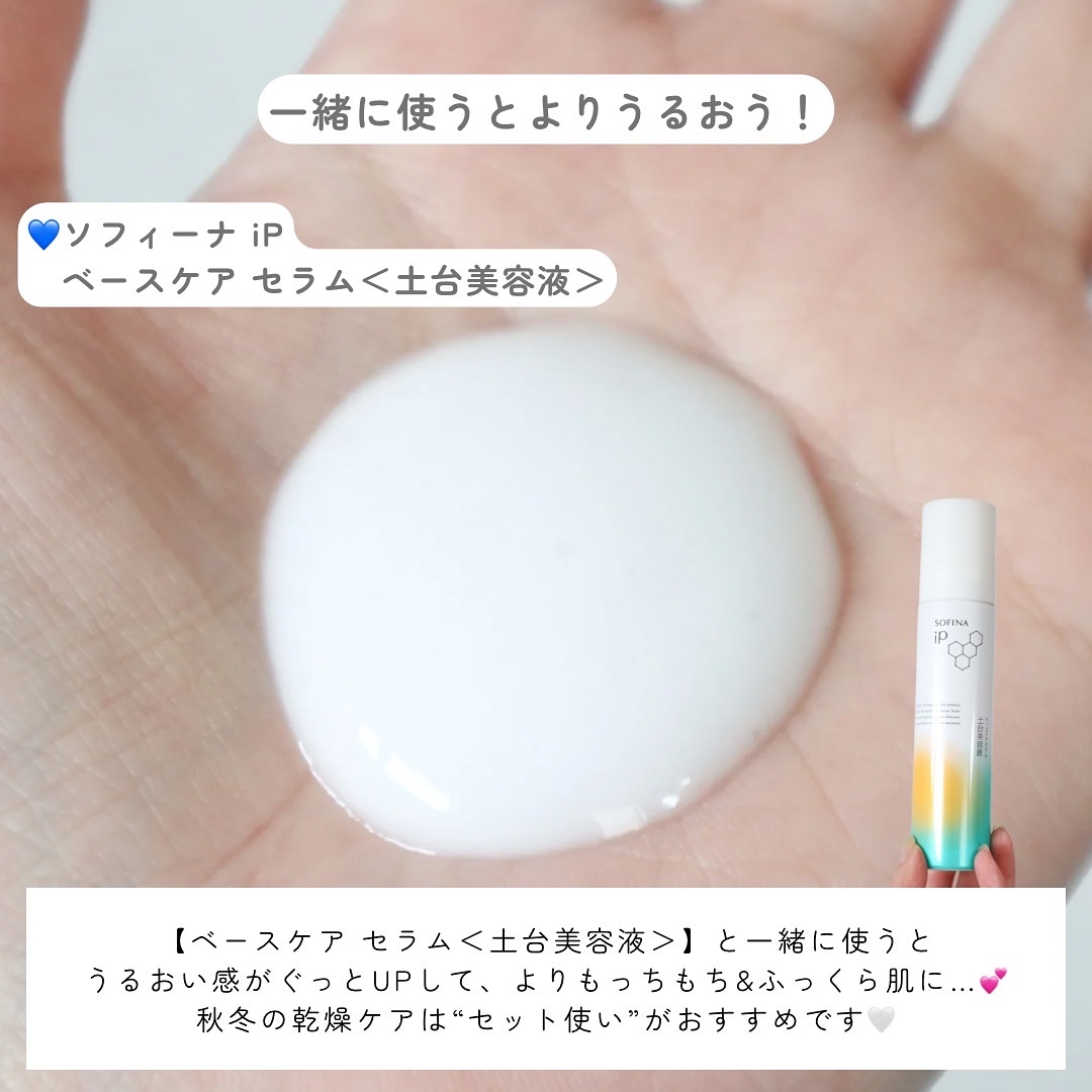 SOFINAiPソフィーナiPベースケアセラム<土台美容液>最近よくみるサンプルもらったので使ってみた、もっちりタイプの美容液で少し色味があった保湿される感じ🤍#導入美容液#SOFINA#美容