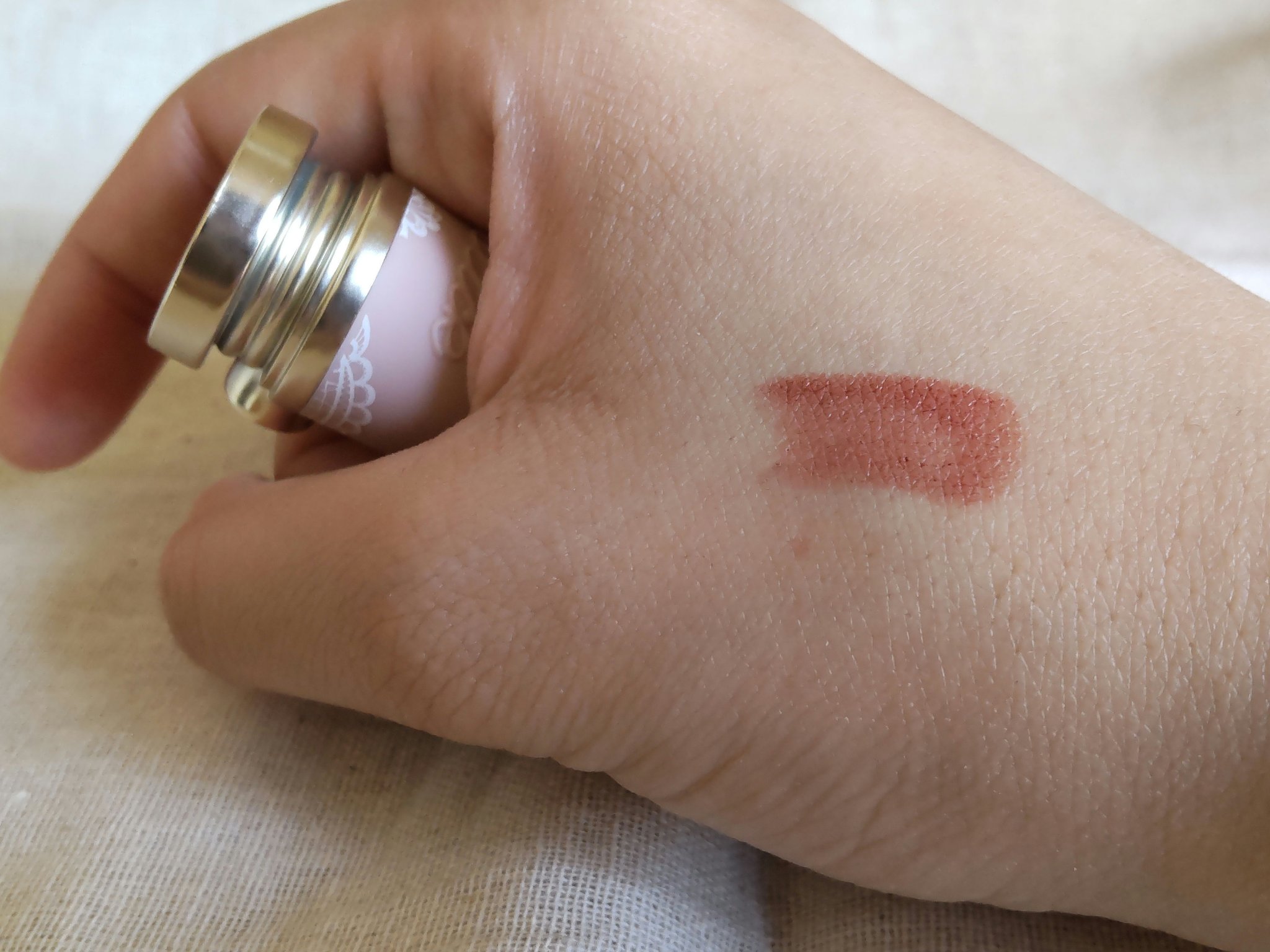 手に塗ってみると艶感のあるピンクバーガンディです。 見た目が可愛いです。ラデュレを思い出させます。 女王のカメオシリーズはリップスティックやマルチパレットが女性の名前になっています。名前が一緒の方が身の回りにいればプレゼントとしてもいいと思いました。