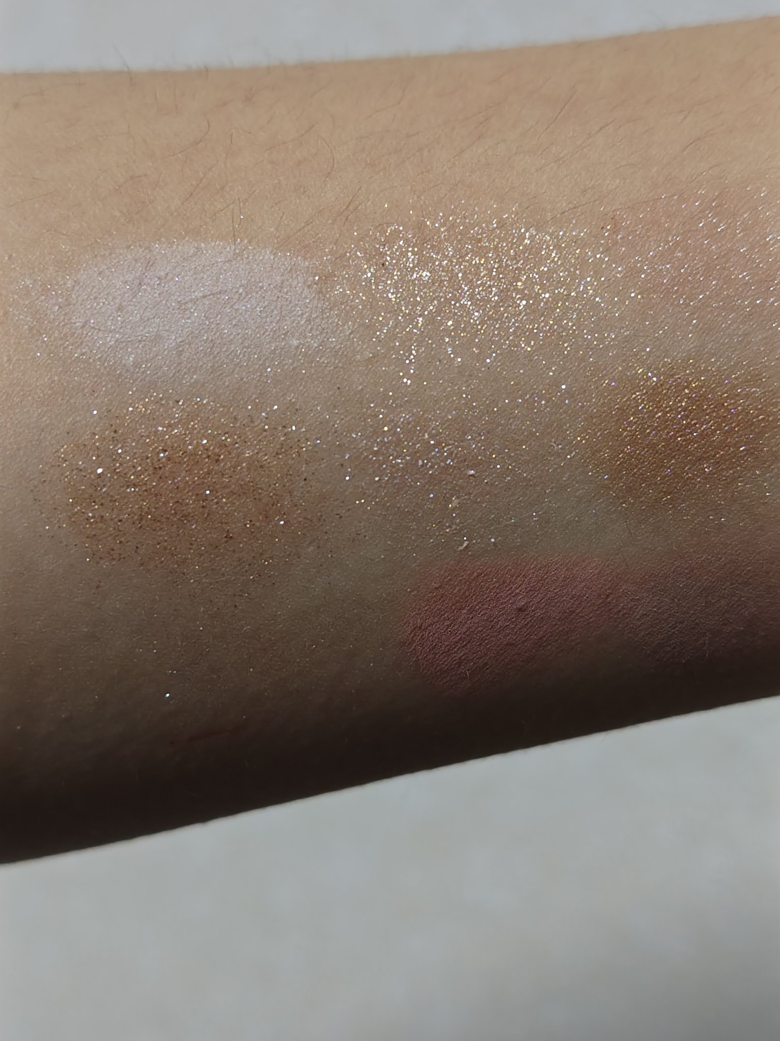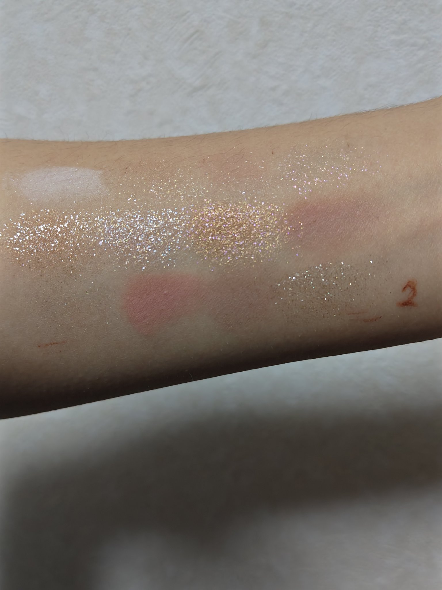 1と3の部分の粉がかなり密着しづらく、外出すると色が薄くなってると感じました💦 2のラメもつきづらくかなりの量付けないとラメ感が無いと感じました💦 5だけはかなり少しの量でもかなりキラキラします。