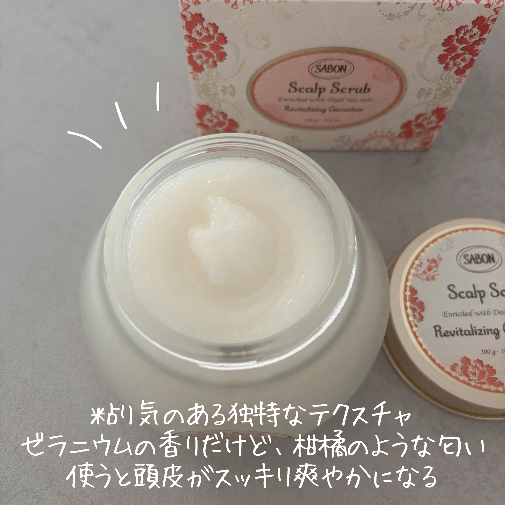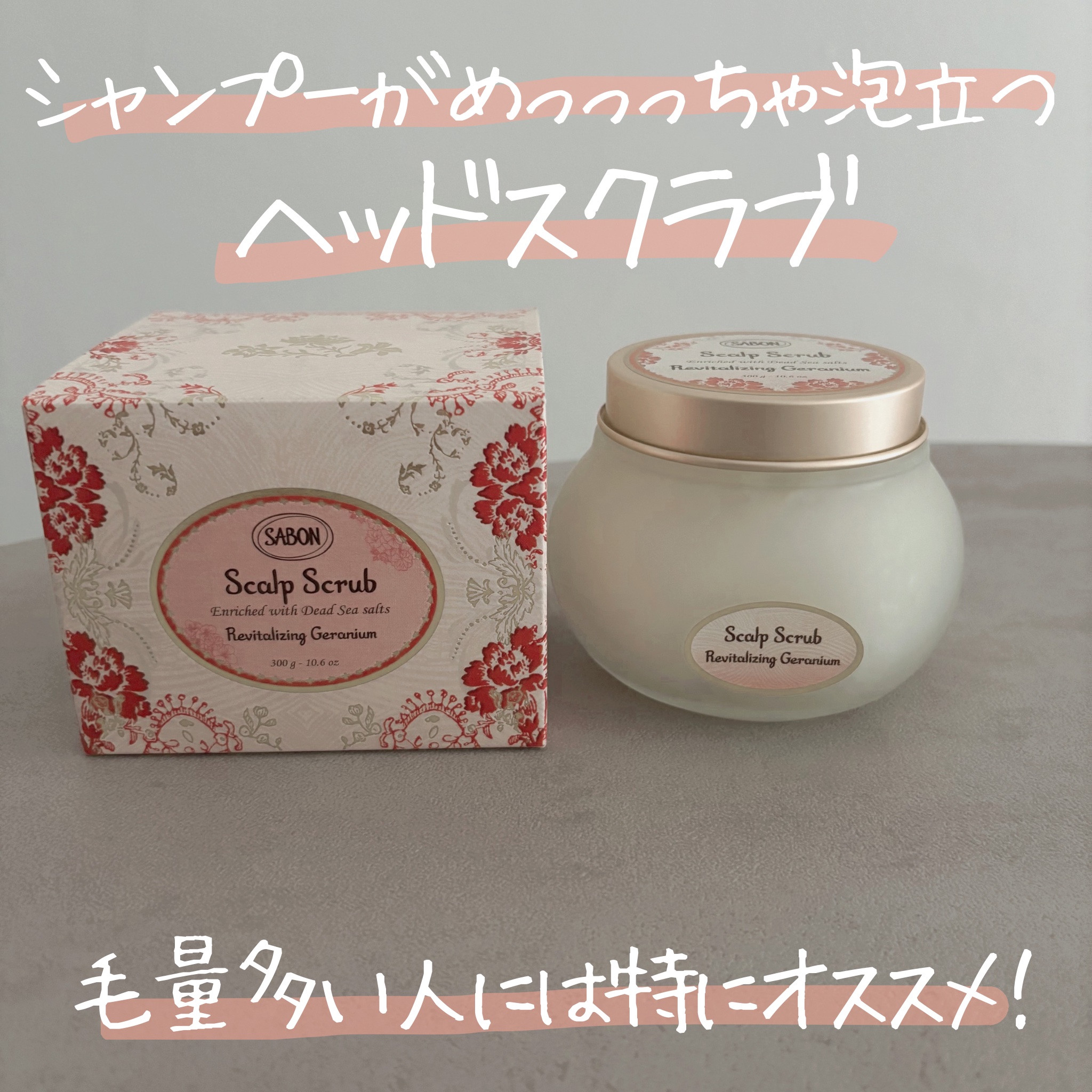 SABONヘッドスクラブリプレニッシングゼラニウム300g🌼念願のヘッドスクラブ!ザラザラしているけどちゃんと泡立つの不思議乾いた髪にちゃんとお湯を通して汚れを取ってから毛穴にスクラブを付けて弱い力でゴシゴシすると泡立ってくる!洗い流した後はカピカピになるけどちゃんと汚れとか油分が落ちてる証拠だそう!その後のシャンプーちょっとキシむから怖いけど優しく洗ってトリートメントして流してから乾かすと毛穴さっぱりする!週1で使ってるけどダメージも感じないし汗かいた時のちょっと籠ったにおいも気にならなくなってきた〜大容量でコスパも良い気がする!リピしたい!ゼラニウムは爽やかな匂いでとても良い💮