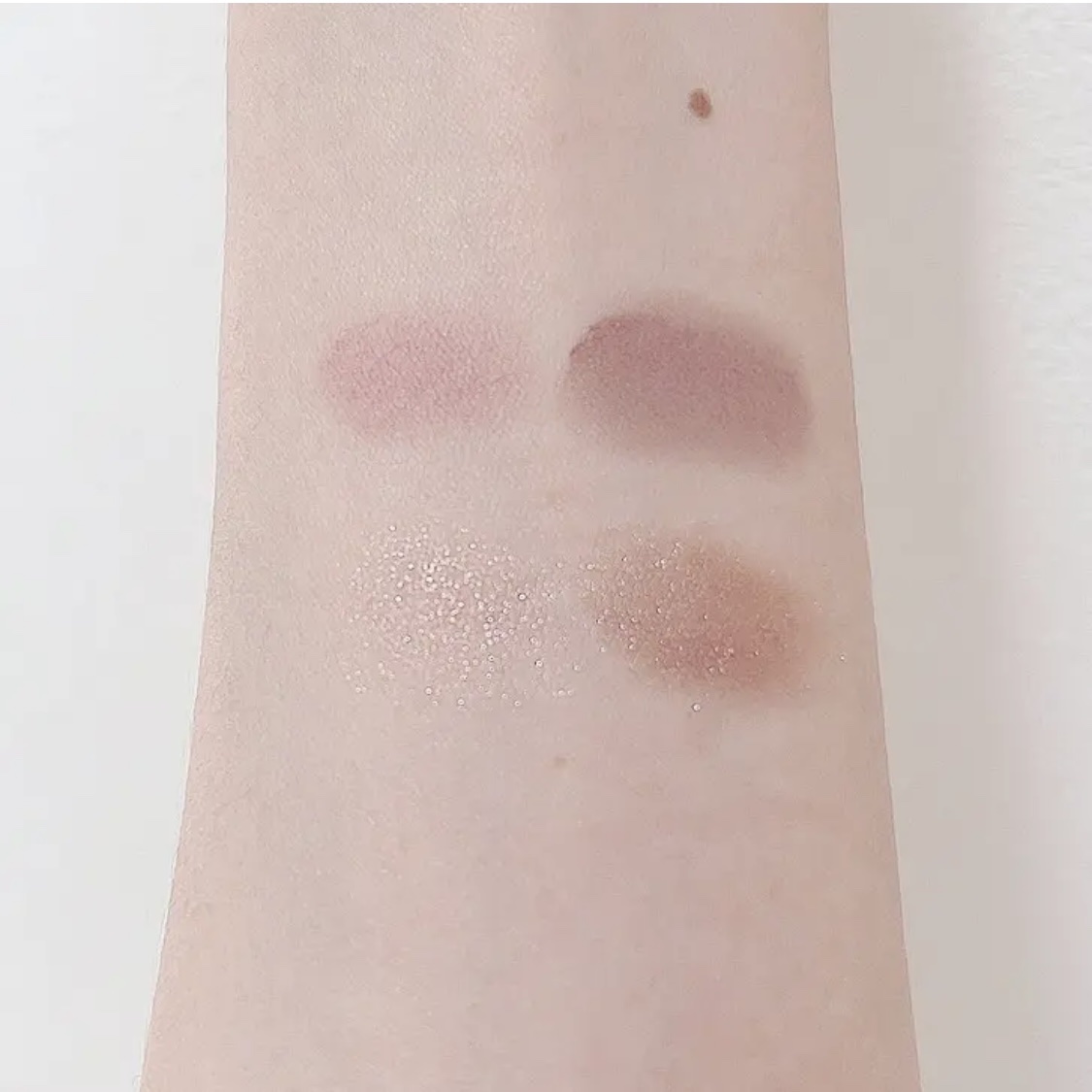 結論からいうと、4色とも、発色もよくてとっっても可愛かった🩷 上の2色のマットカラー&下のラメ2色を組み合わせることで目元がさらに綺麗に見えたよ🎵 ラメも大きくないからギラギラとラメが強調されることもなくさりげなく〜キラキラな目元が叶う🩷 マットカラーは粒子が細かくサラサラな粉質! 密着度も高く、時間が経っても、くすんできたり崩れなども特に気にならなかったので他のカラーも購入してみようと検討中💬 薄く淡い発色なので、きっとメイク初心者さんにも使いやすいパレット🎨だと思います!