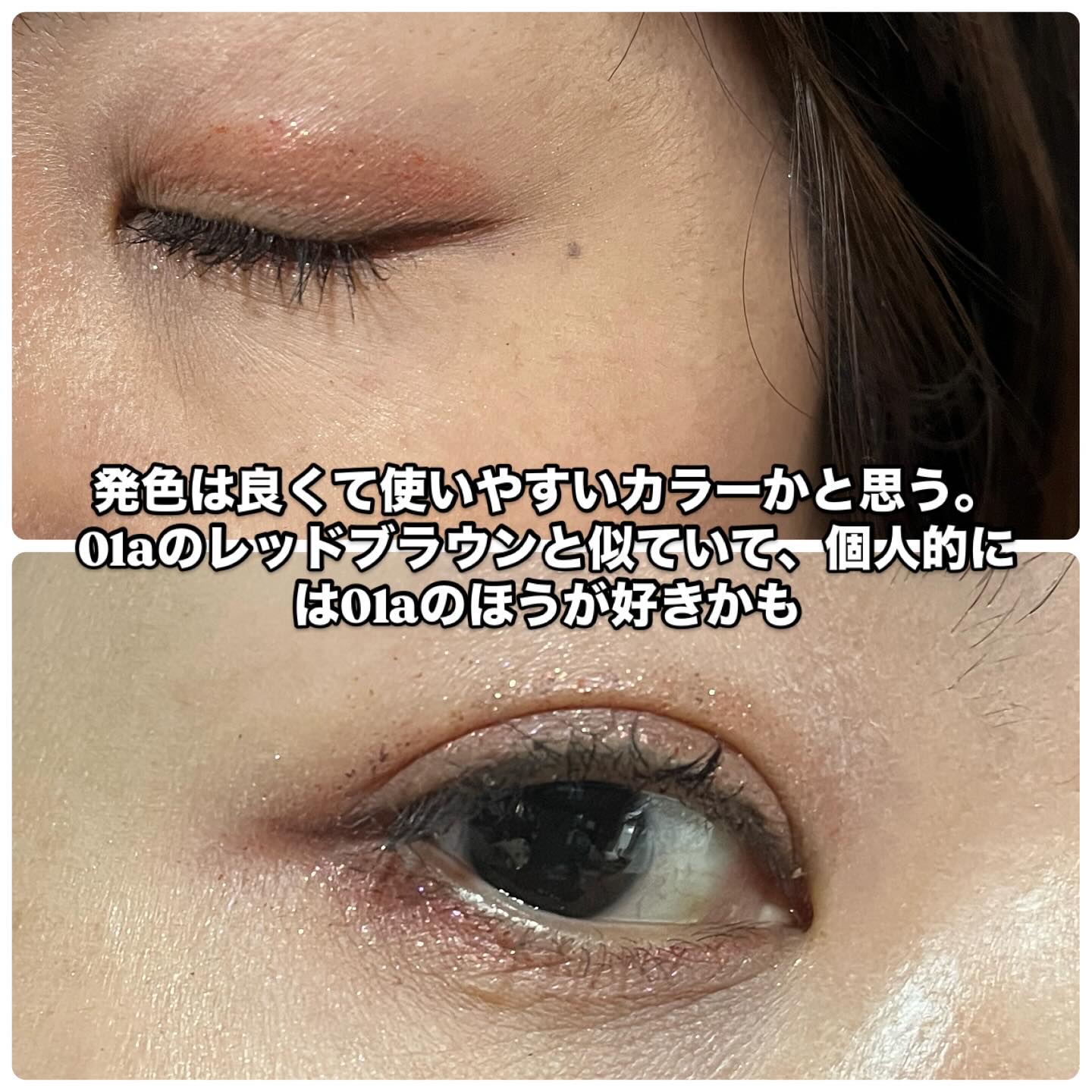01a レッドブラウン 落ちついた赤みよりのブラウンで一番誰もが使いやすいカラー。 04a サフランゴールド イエローとゴールドの間のようなカラー。 上から重ねたり下瞼向きかな◎ 07a ピーコックブルー クールな印象を与えそうなブルーシルバー。