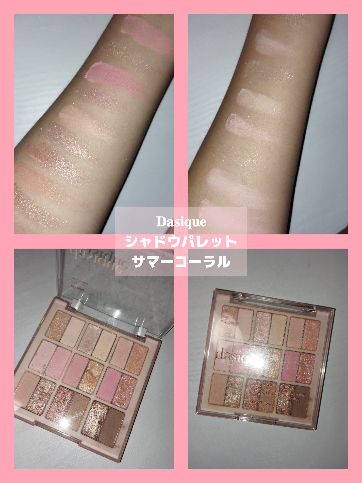 🪸dasiqueシャドウパレット23サマーコーラル🪸🍑夏メイクがしたくて買ったサマーコーラル🪸🍑スウォッチのため腕には濃いめに乗せました!私自身、ピンクに苦手意識があるので真ん中列のピンクたちが思ったよりピンクでウワァアアアってなったけど薄め...