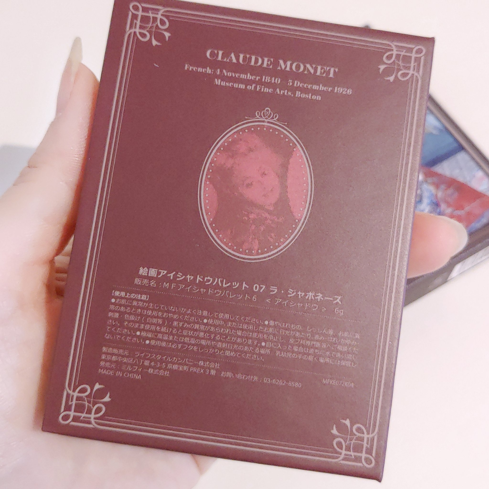MilleFée〈ミルフィー〉 絵画アイシャドウパレット モネシリーズ 04.日傘の女 透明感のある青ラメが綺麗。清純な仕上がりになる。 05.画家の庭 オレンジベースのパレット。フレッシュな仕上がりになる。 06.睡蓮 繊細な青ラメとピンクラメが入ったパレット。儚げな仕上がりになる。 07.ラ・ジャポネーズ ブラウンベースのパレット。しっかりとした陰影を作ることができる。 モネシリーズのコンプリートBOX♡ どのパレットも絵画を連想させるような配色や刻印がされていて拘りを感じましたˊ˗