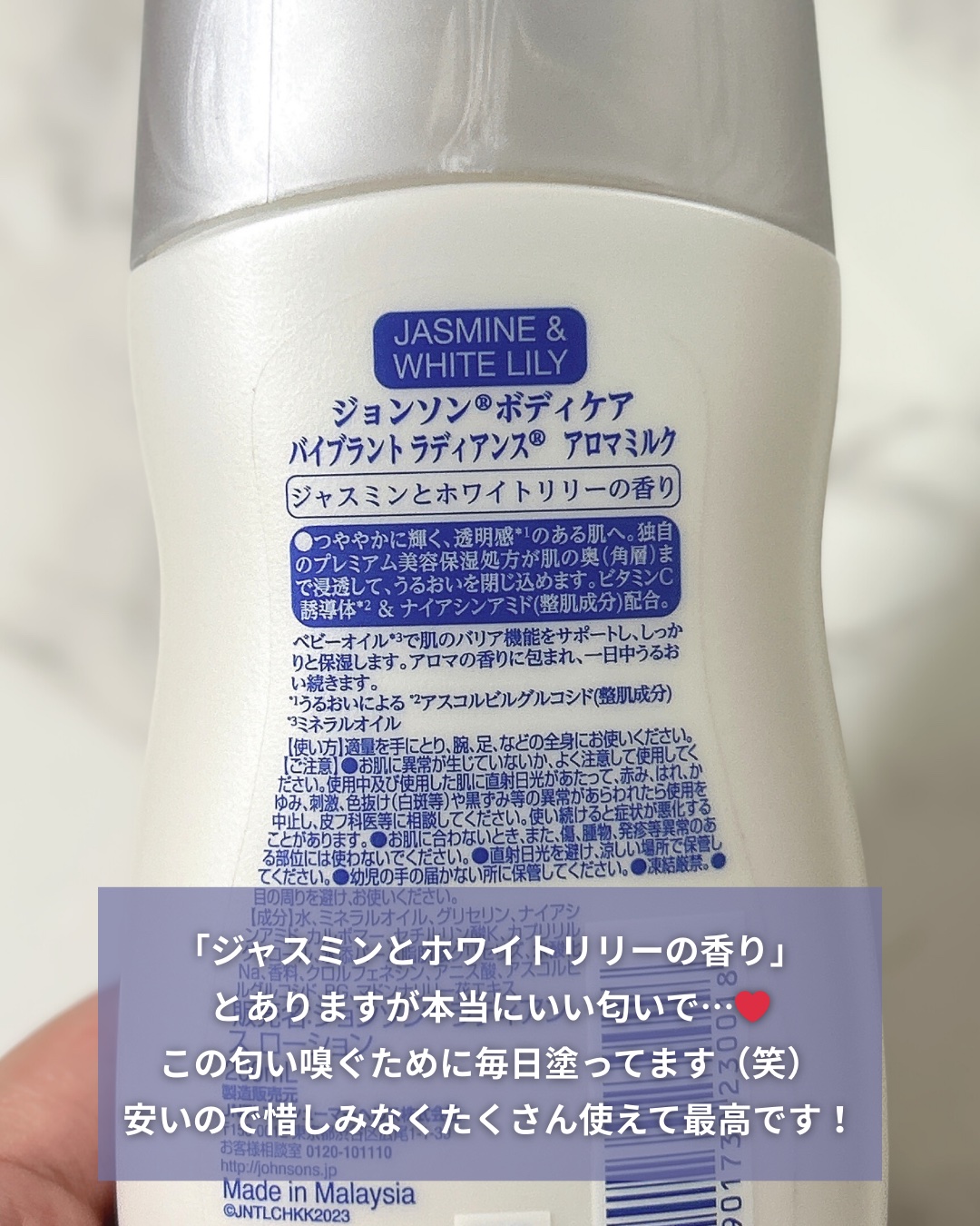 ジョンソンボディケアバイブラントラディアンス アロマミルクジャスミンとホワイトリリーの香り娘購入品ビタミンC誘導体とナイアシンアミド配合のボディミルク。ベタつかない水分感ある乳液タイプでさっぱりとした保湿感。テスターでこちらの香りが1番気に入...