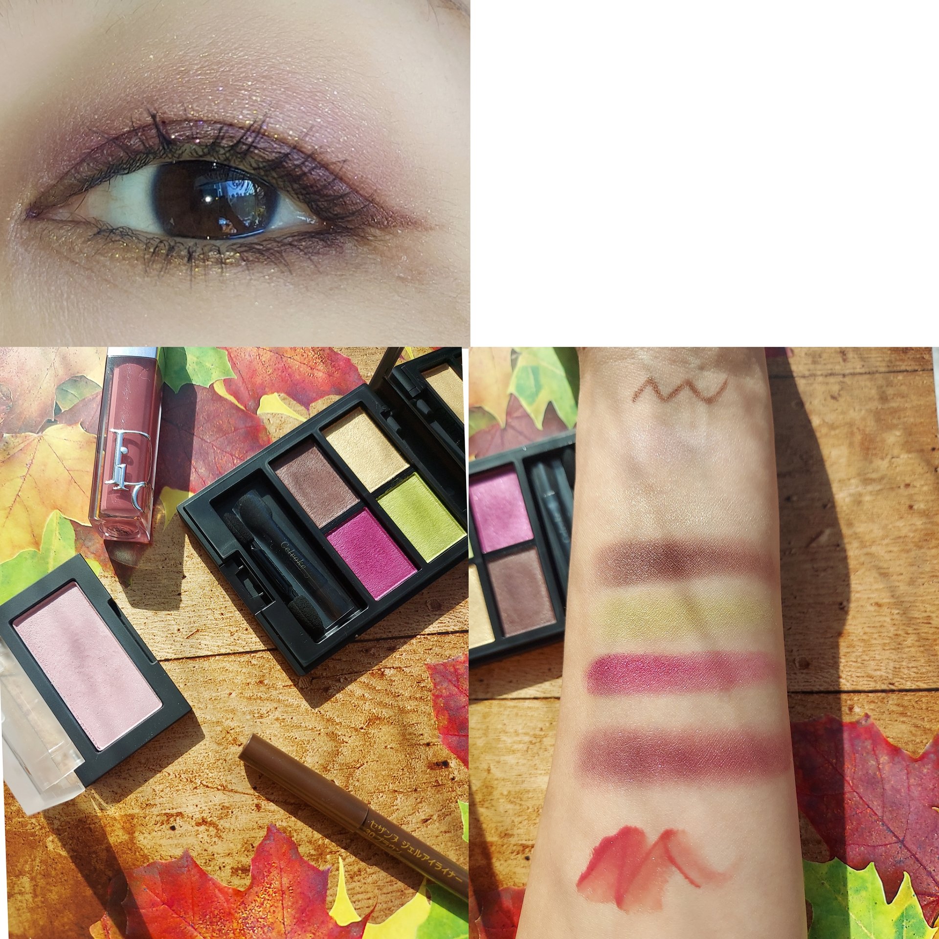 このブラウンがまたすごく綺麗で。スウォッチに混ぜた色も載せました。 チークはDintoのブラーラジエンスチークです。 マキシマイザーは、26番。 ライナーはセザンヌブラウンを少し太めに入れました。 このイエローのラメも可愛くて好きです💛