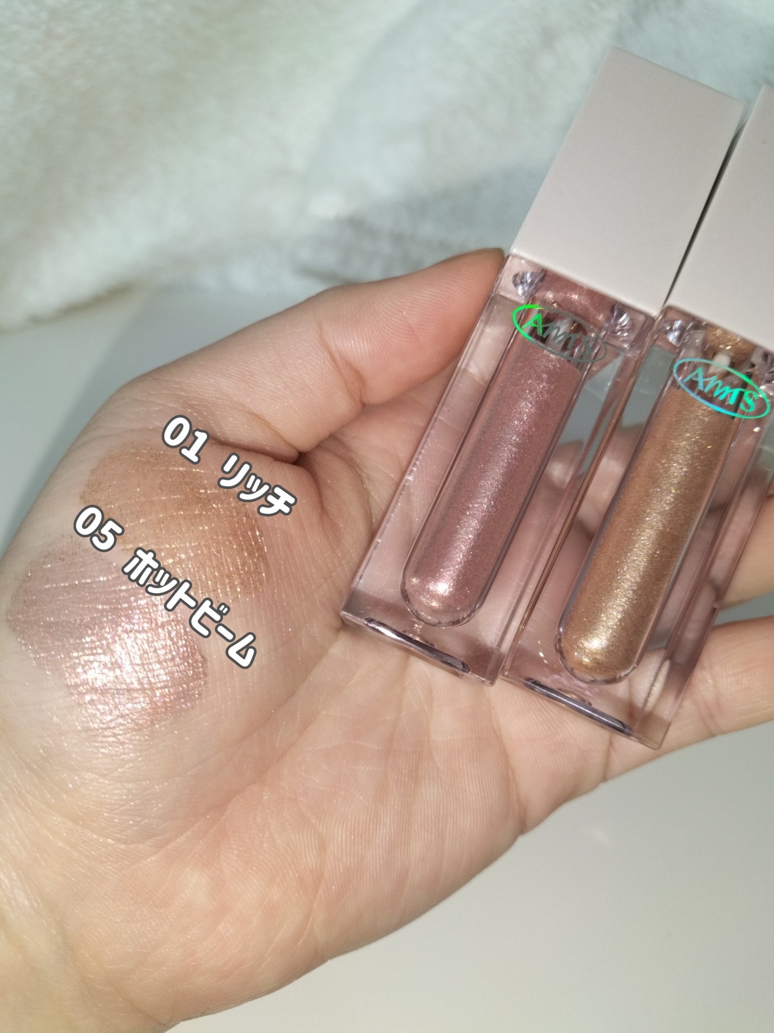 リキッドアイシャドウの中では比較的サラサラとしたテクスチャーでラメがたっぷり入っています。 01 リッチ ベースの色はあまり発色しませんが、ゴールド系のラメが入っているのでとても華やかな印象になります。 05 ホットビーム ピンクをベースとしたゴールドやシルバーのラメが入っています。