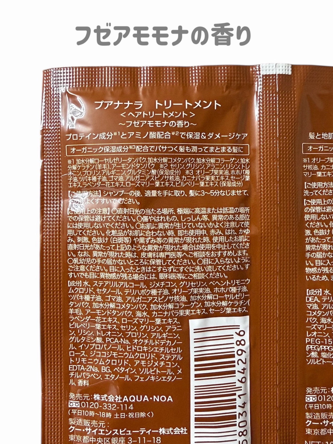 プアナナラシャンプー/トリートメントトライアルサシェット♡ポイント♡・深いコクのあるフゼアと甘いバニラが優しく香るフゼアモモナの香り