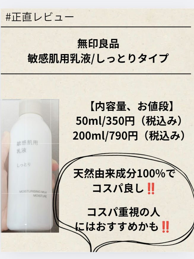 【使った商品】無印良品 敏感肌用乳液しっとりタイプ 200ml ¥350【商品の特徴】敏感肌用乳液【肌質】乾燥肌 敏感肌 アトピー肌【テクスチャ】しっとり乳液【どんな人におすすめ?】・乾燥肌で敏感肌の人のスキンケアに・肌に優しいスキンケア探し...