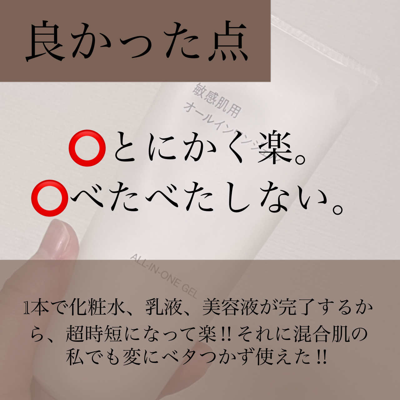 こんばんは🌆 ゆきちと申します。閲覧いただきありがとうございます😊本日は、無印良品の敏感肌用オールインワンジェルを正直レビューします‼︎💰商品名無印良品 敏感肌用オールインワンジェル💰容量150g💰値段¥1490💰商品紹介①これ1本で、化粧水、乳液、美容液が完了する‼︎②無香料、無着色、無鉱物油‼︎さらに弱酸性、パラベンフリー、フェノキシエタノールフリー、アルコールフリーで敏感肌さんにおすすめ‼︎✼••┈┈••✼••┈┈••✼••┈┈••✼••┈┈••✼※ここからは私個人のレビューになります💰評価⭐️⭐️⭐️⭐️(5段階評価)時短が叶うので、ずぼらな私には助かる1品🥺✨💰良かった点⭕️とにかく楽‼︎1本で3役なので、化粧水、乳液、美容液をそれぞれ3本使う時よりも圧倒的に時短になって便利‼︎⭕️ベタベタしない。ジェル状になっているので、混合肌の私でも変にベタつかず使えた‼︎💰注意点😭つけすぎるとモロモロする。うっかりつけすぎると、すごいモロモロしたものが出てきたので、量だけ気をつけて‼︎公式の量(2センチ程度)で使いましょう。💰最後にここまで閲覧いただきありがとうございました😊✨様々なコスメの正直レビューを投稿しておりますので、投稿へのいいね、保存、アカウントのフォローをしていただけると励みになります💰#無印良品#敏感肌用オールインワンジェル#スキンケア#正直レビュー#プチプラ