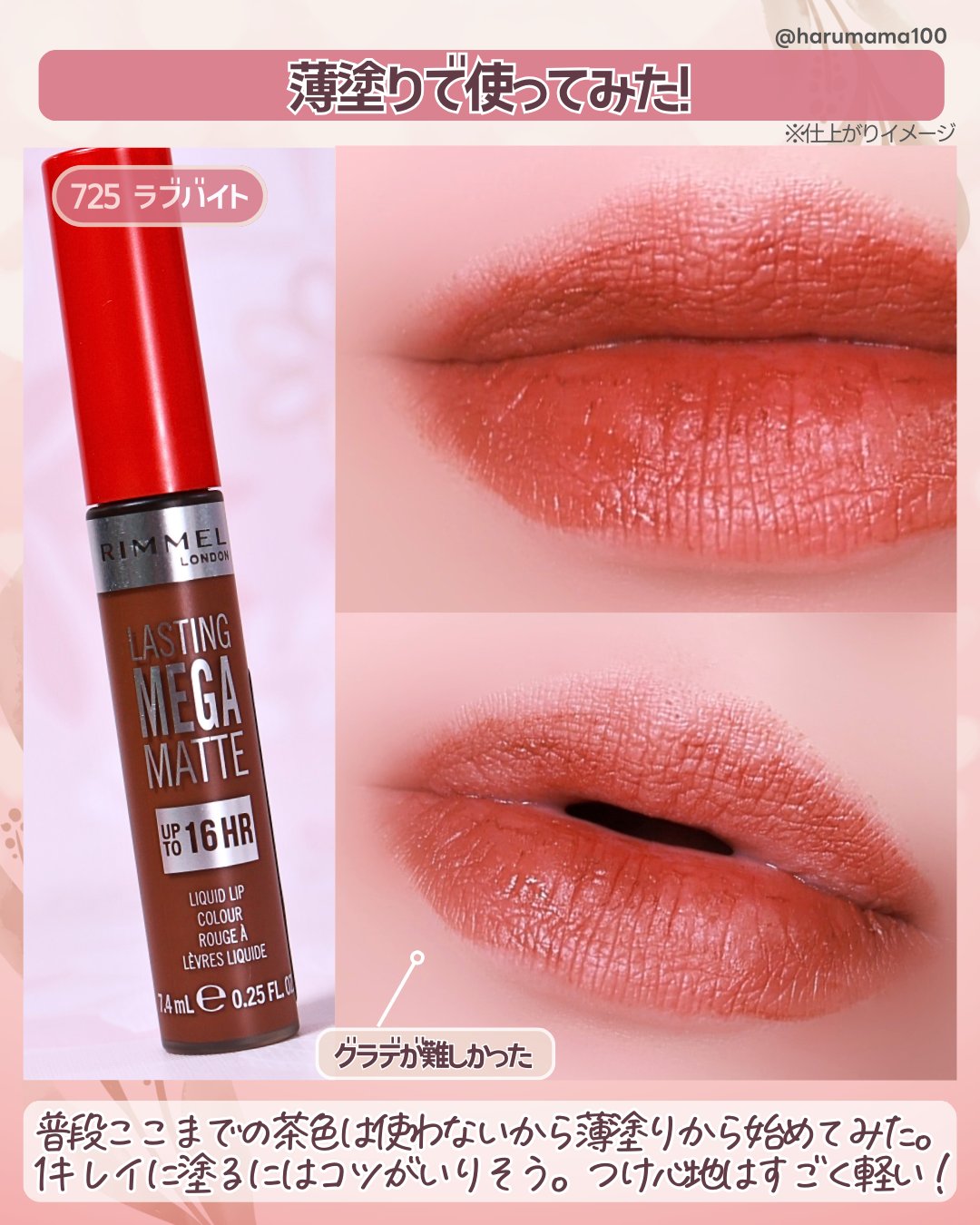 。oOo。.:♥:.。oOo。.:♥:.。oOo。.:♥リンメルロンドンラスティングメガマットリキッドリップカラー725ラブバイト860アーバンアフェアふわっとエアリー、ぽわっと発色。16時間続く超軽量マットリップ。軽いつけ心地のマットリップが新登場。とろけるように馴染む滑らかな質感と、ポワッと色づく発色。ロングラスティング処方。マットだけど潤い処方で唇に優しい。100%ヴィーガンだから動物&地球にも優しい見たい。725ラブバイトは垢抜けブラウン860アーバンアフェアはモードブラウンリンメルのブラウンリップは昔からドンピシャカラーだから好き♥️今日も見て頂きありがとうございます(❁ᴗ͈ˬᴗ͈)❤️👤📎もありがとうございます(❁ᴗ͈ˬᴗ͈)#リンメルロンドン#ラスティングメガマットリキッドリップカラー#725ラブバイト#860アーバンアフェア