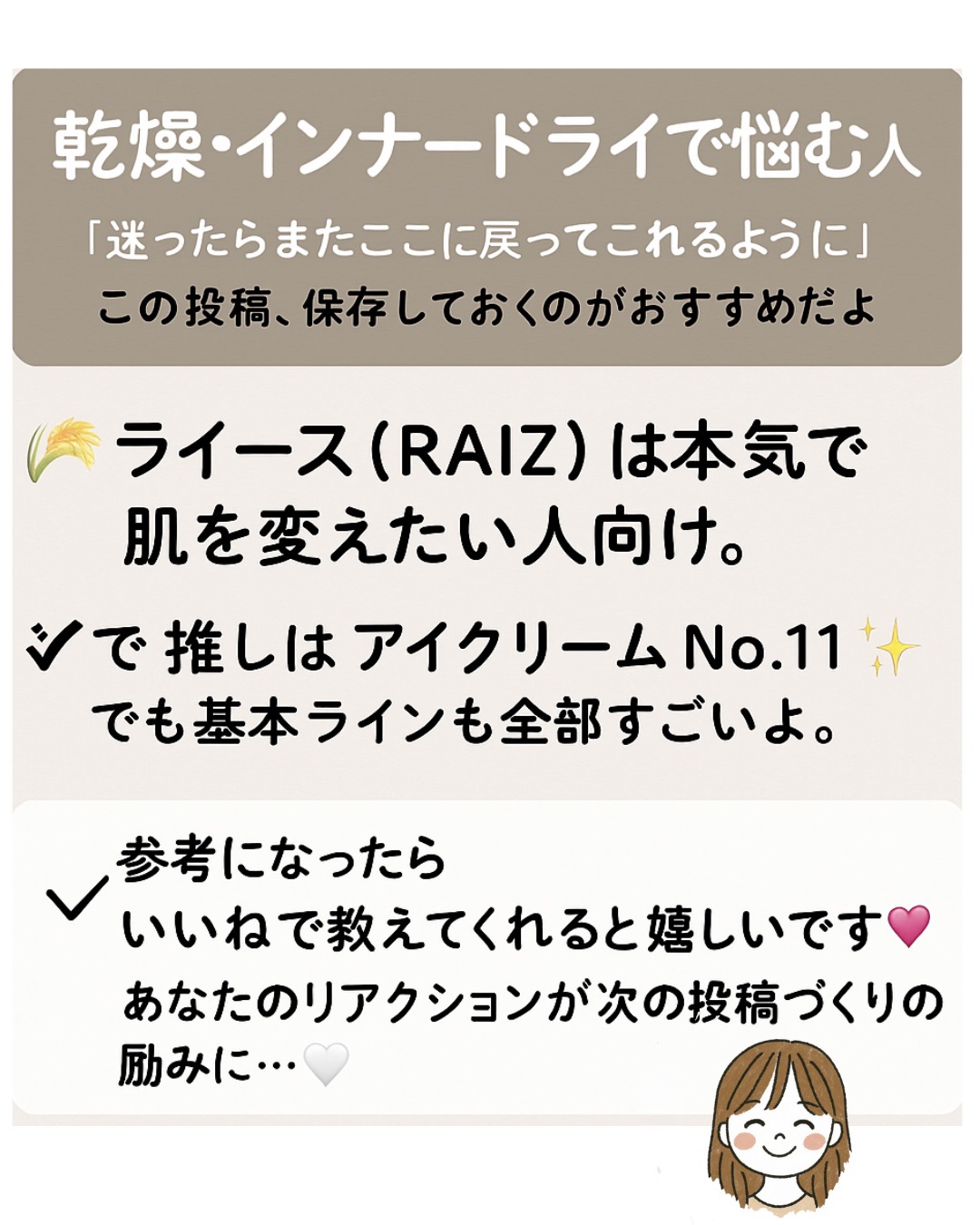 検定勉強中でこれすごいなと思ったのが成分が「ライスパワーNo.11」。ライスパワーは"その場しのぎの保湿”じゃなくて、肌が自分でうるおいをキープする力をサポートしてくれる成分だから乾燥してもすぐカサカサに戻っちゃう表面はベタつくのに中が乾く、保湿しても潤いが続かないこんな悩みの人にとくに合いやすいと思う。私の推しブランド「ライース(RAIZ)」いまここのトライアル使ってるんだお肌調子いいの!!ライスパワーをしっかり使っていて、ローション・美容液・クリーム・アイクリームのラインでまとまりがいいのも好き。特に推したいのはライースインナーモイスチュアアイクリーム・変化がわかりやすくて、乾燥ぐすみ・インナードライで悩む人にオススメだよ。気になってる人の参考になれば嬉しいな。#ライスパワー#乾燥肌#乾燥ケア#ライース#RAIZ#インナードライ