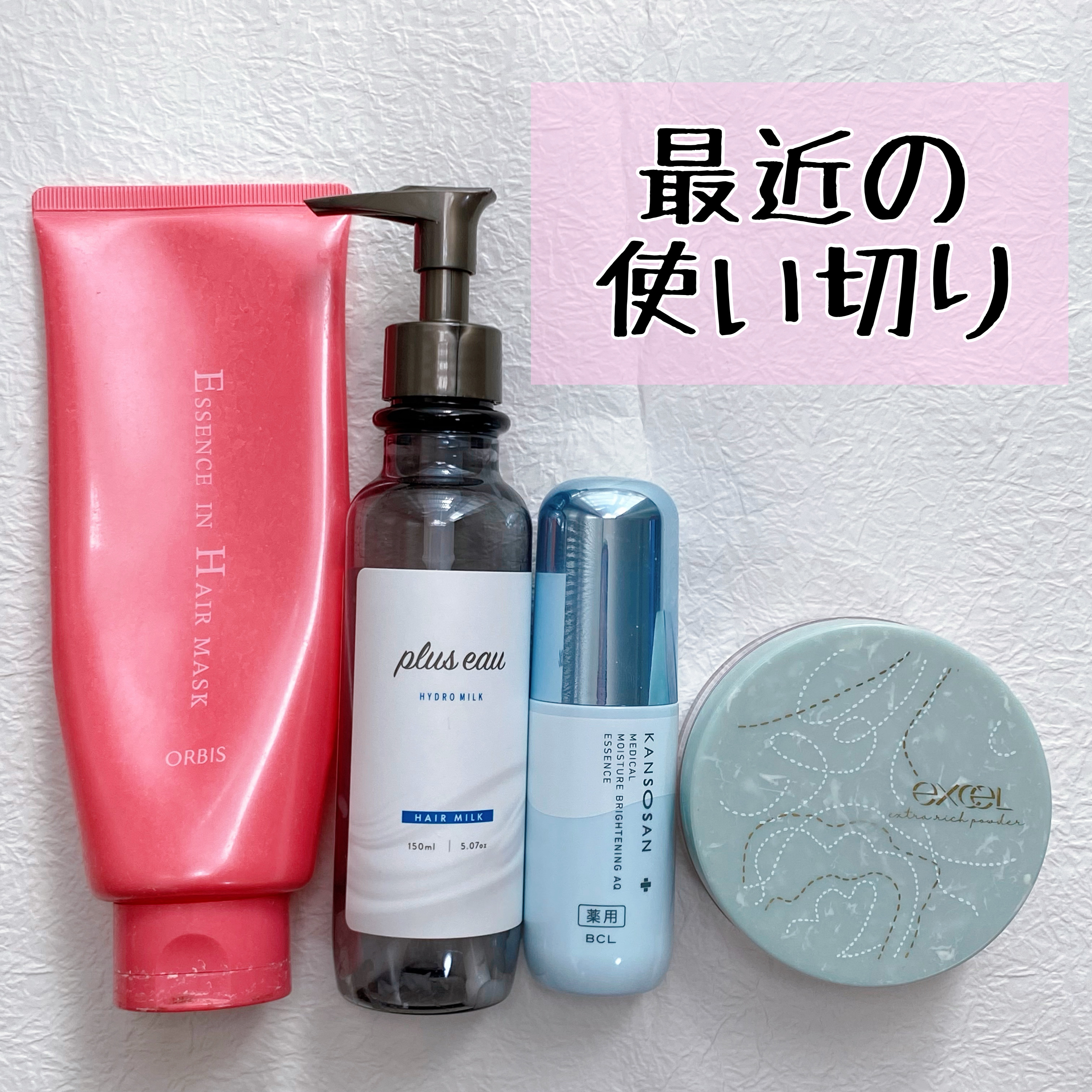 最近の使い切りレビュー○エクセルエクストラリッチパウダー20g23年発売の限定品。2年弱保った!付属パフも厚みがあってふかふか。粉質がしっとりで、パフで適当にばふっと乗せてもムラにならず肌に溶け込むのが良い。リニューアル定番品のセラムインパウダーも既に購入して使っている。おそらくまたリピするだろう大満足な商品。○乾燥さん薬用水分ブライトニングエッセンス48ml無香料でさらっとしていてクセなく使いやすい。敏感肌の私でも使えた!美白目的ではなく、スキンケアの追加の保湿として使っていた。朝夜2プッシュ使用で2ヶ月保つ。4本目使い切り。○プリュスオーハイドロミルク150ml普通〜しっとりめ。無香料なのが良い。かなり保ったしコスパ良いと感じる。これの前に使っていたオルビスヘアミルクより好き(オルビスの方が軽め)リピしたい。○オルビスエッセンスインヘアマスク200gすぐ洗い流せるのでせっかちな私には良い!わりと軽めの仕上がり。無香料なのが良いと思う時もあったが、ヘアミルクも無香料なので香りが欲しいと思うように(笑)うーん、可もなく不可もなくといった感じなのでリピはしないだろうな。#使い切り