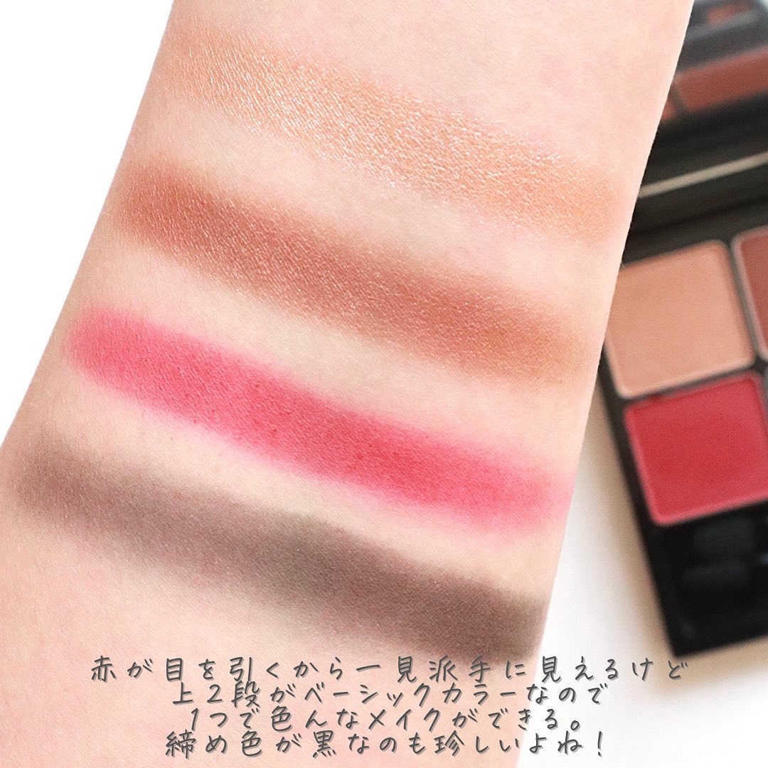 コンセプトは、品よく、色っぽく、ナチュラルに。単色使いはもちろん、重ね方やブレンド次第で印象が変わり、幅広いアイメイクが楽しめます。 粉質がとにかくしっとり、高発色持ちも良くて¥3300??って思う。 単色使いもブレンディングも自在♪赤はチークに使ったり、パレット全体で眉毛も描いたりとトータルメイクで統一感も出せる。