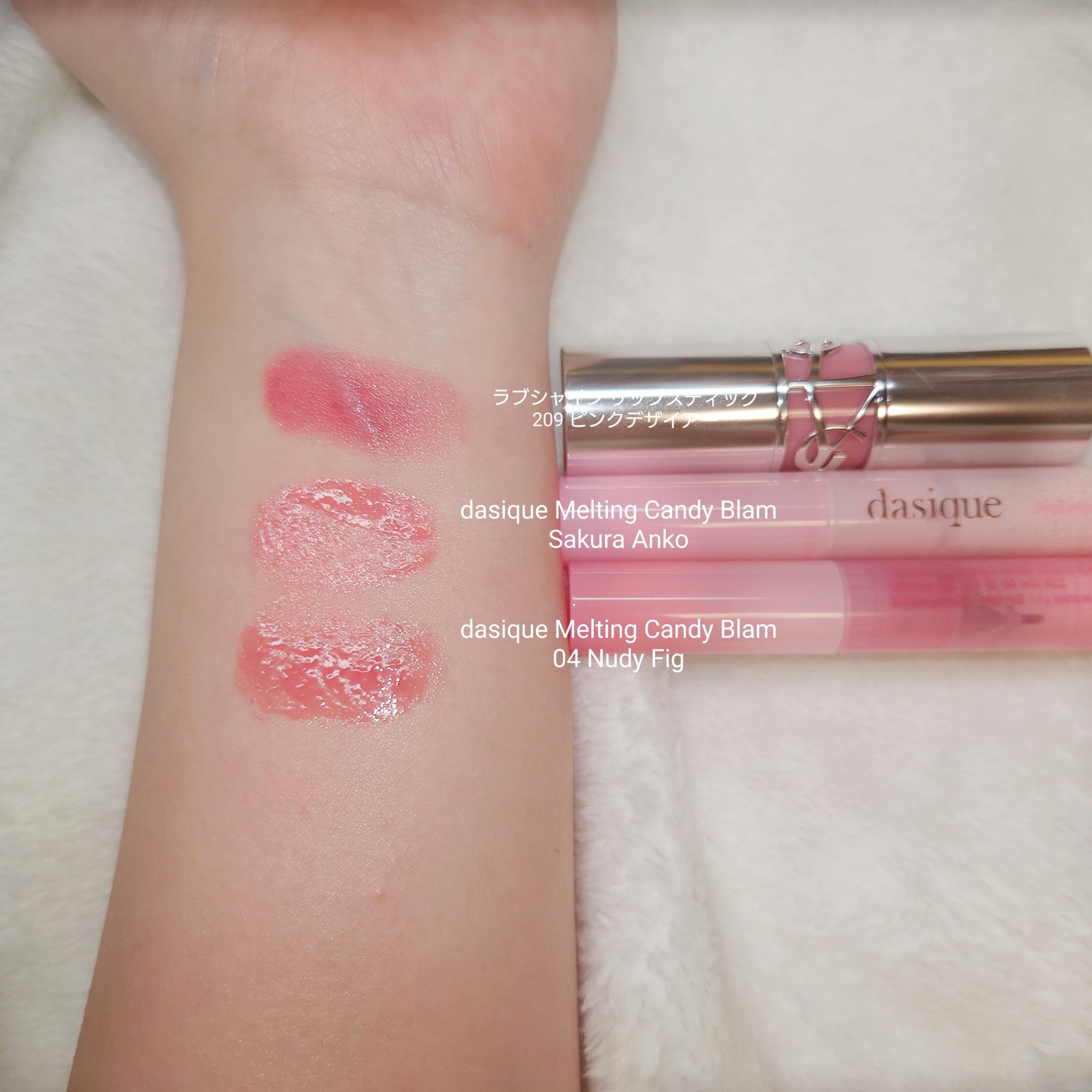 YSLラブシャインリップスティック209ピンクデザイアー今回は先日紹介したリップの手持ちリップで似ているものとの色味比較になります。過去の限定のものや現在は廃盤のものも多いですが、色味の参考になったら嬉しいです。個人的にはルージュヴォリュプテシャインのロゼルルが似てる気がしました!🤔リップモンスターなら107番が近いと思います。ちょっと遠くて分かりにくいかもですが…✨今回比較したリップ一覧です✨YSLラブシャインリップスティック209PINKDESIREYSLルージュヴォリュプテシャインNo.153ロゼダンテルYSLルージュピュールクチュールヴェルニウォーターステイン617ダイブインザヌードYSLルージュヴォリュプテシャインNo.124ロゼルルKATEリップモンスター07ラスボスKATEリップモンスター133:00AMの微酔KATEリップモンスター107紅折り紙の願いDiorディオールアディクトリップスティック422ローズデヴァンViséeネンマクフェイクルージュPK850うさぎの恋人ViséeネンマクフェイクルージュPK851わがままな肉球rom&ndデュイフルウォーターティント13カスタードモ-ブrom&ndデュイフルウォーターティント16チアリーピンクdasiqueメルティングキャンディーバーム04NudyFigdasiqueメルティングキャンディーバームSakuraAnko