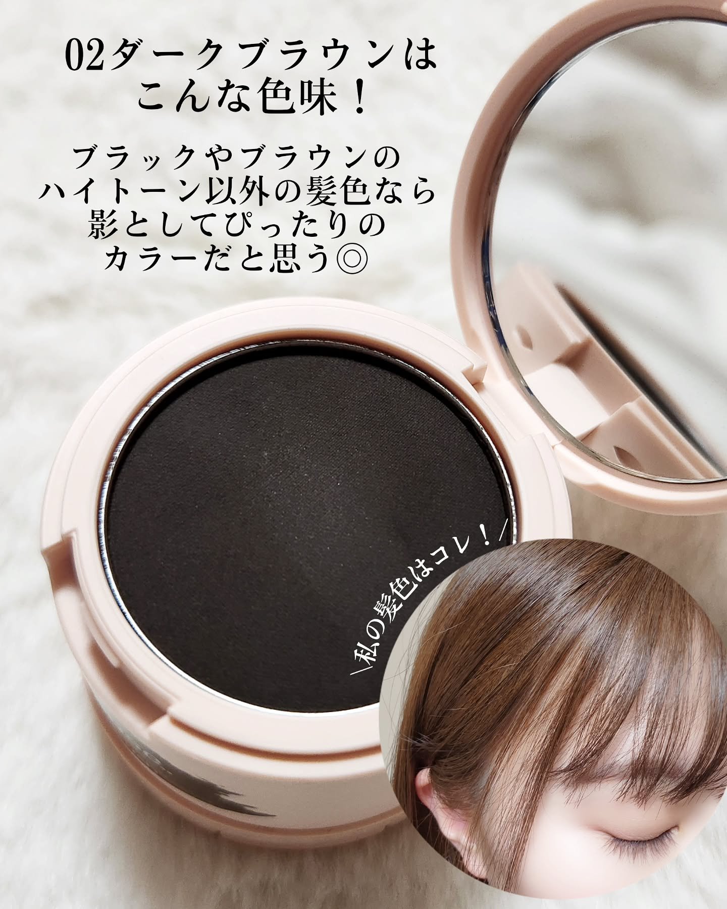 パウダーはしっとりしていて粉っぽくならず、自然な陰影が作れます。 02のダークブラウンを使いましたが、ヘアカラーをしていない自分の髪色にはぴったりでした。 容器の底を立ち上げて持ち手にできたりミラーが付いていたり、外出先でもさっと使えるし、使い勝手が考えられていて優秀だなと思いました。