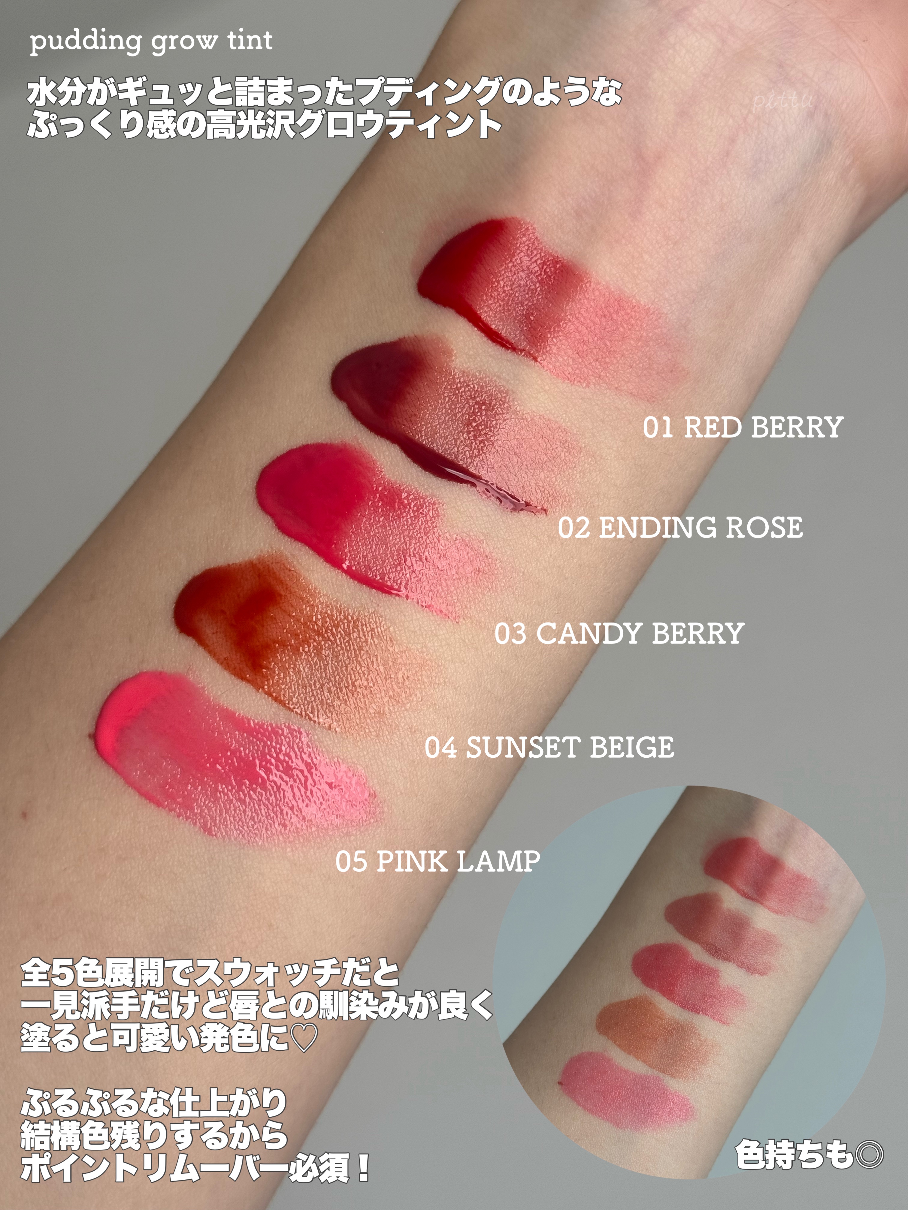 ご閲覧ありがとうございます🌻\まるでプリン🍮みたいなぷるつや/🌈LOVBLOVBPuddingGlowTint🌈パケかわいすぎんか…🥺宝石みたいなキャップとポップなカラーがかわいくて思わず手に取りたくなる…💓時間が経過するほどよりぷっくりと輝くプディング光沢を演出してくれるんだって🫧・れっつとらい。これ色持ちすごかった!(スウォッチした腕をオフするの大変だったくらい🤣)みずみずしいテクスチャーで軽い使用感✨・✔️01RedBerryレッドベリー派手すぎず気軽に塗れる血色感のあるレッド💋赤リップが苦手な人にこそ使ってみてほしいカラー✌️ぱきっとした色味じゃないから合わせやすいよ✌️✔️02EndingRoseエンディングローズミュートな雰囲気のローズカラー🥀落ち着いたローズカラーだからお仕事にも🙆♀️✔️03CandyBerryキャンディーベリーフェイストーンを華やかに見せるラズベリーピンク🍓華やかさが出るけど派手すぎない愛されピンク🩷✔️04SunsetBeigeサンセットベージュ夕焼けの奥深い雰囲気を表現したミュートなベージュコーラルほんのりオレンジ感ある🍊肌馴染み◎カラー✨一気に垢抜けた印象になれるよ✌️✔️05PinkLampピンクランプピンク色のランプに灯がともったようなライトピンク🌟新色で蛍光感あるピンクなんだけど塗るとかわいい!人形みたいな唇になれちゃうよ👀!みんなはどのカラーが気になる?👀!Qoo10で買えるみたいだから是非チェックしてみてね🤝・¨¨¨¨¨¨¨¨¨¨¨¨¨¨¨¨¨¨¨¨¨¨¨¨¨¨¨¨¨¨¨¨¨LOVBLOVBPuddingGlowTint¨¨¨¨¨¨¨¨¨¨¨¨¨¨¨¨¨¨¨¨¨¨¨¨¨¨¨¨¨¨¨¨¨#PR#LOVBLOVB#韓国コスメ#韓国メイク#飲み会リップ#コスメ#Qoo10#Qoo10メガ割#ツヤリップ#耐久コスメ選手権