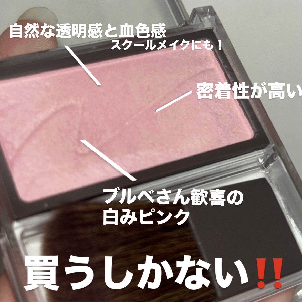 03ミルクモーヴ発売当初にピュアピンクを買って使ってますが、最近は白みピンクにハマってるので買い足しました❤️ほわっとかわいいほっぺにしてくれて、めちゃくちゃいい❣️底見えできそうな小さめサイズでめっちゃ安いし、粉質普通にいいし、パケもクリア...