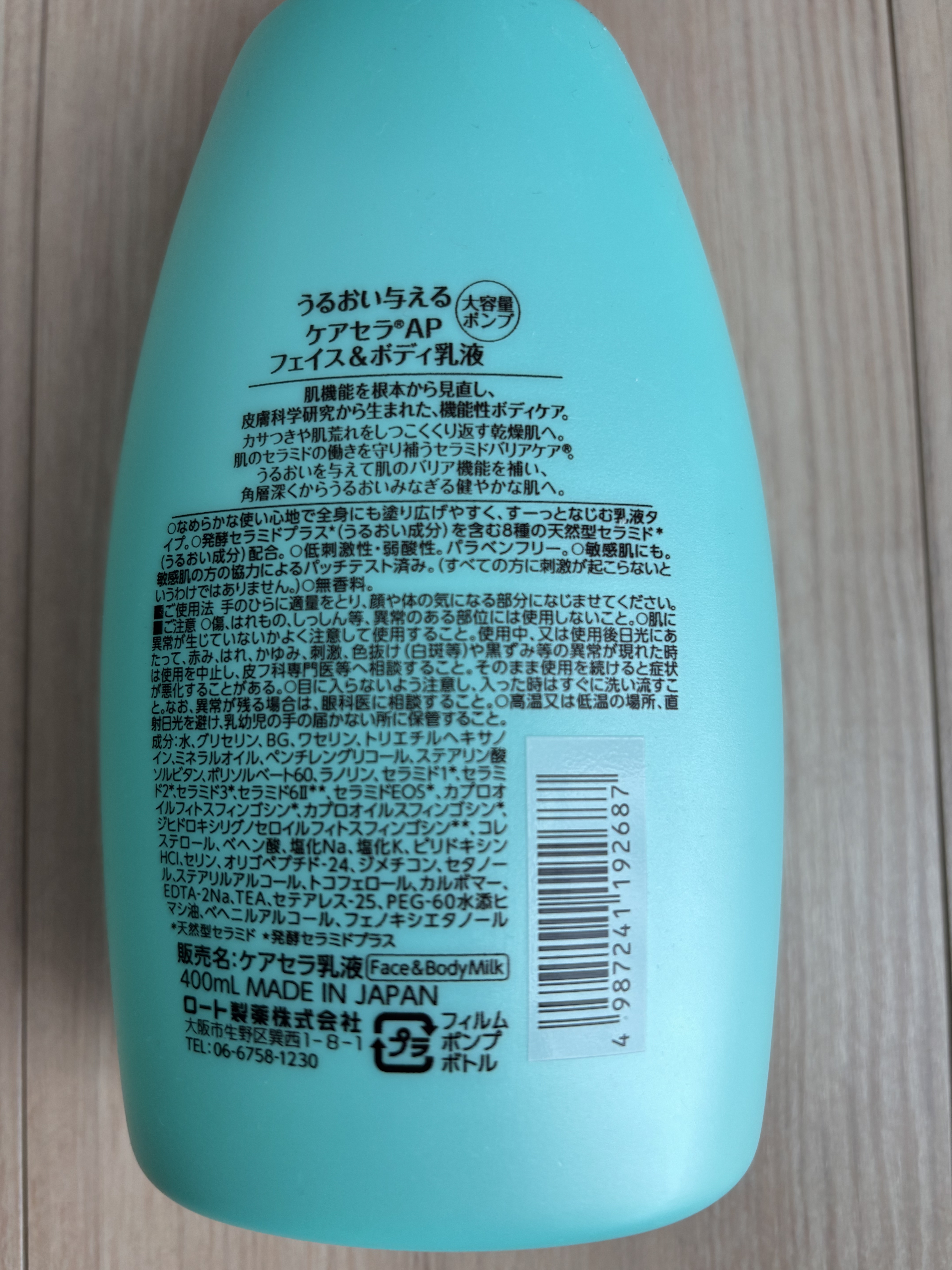 大人も子供も全身に使える 低刺激処方。 ポンプ式で時短 顔も身体もこれ1本で保湿できる ケアセラシリーズ誕生は元々ロート製薬の社員が介護施設を訪れ、高齢者が入浴後に特に粉吹き、乾燥が酷いのを見て【乾燥肌をなくしたい】という熱い想いから誕生したらしい。。。