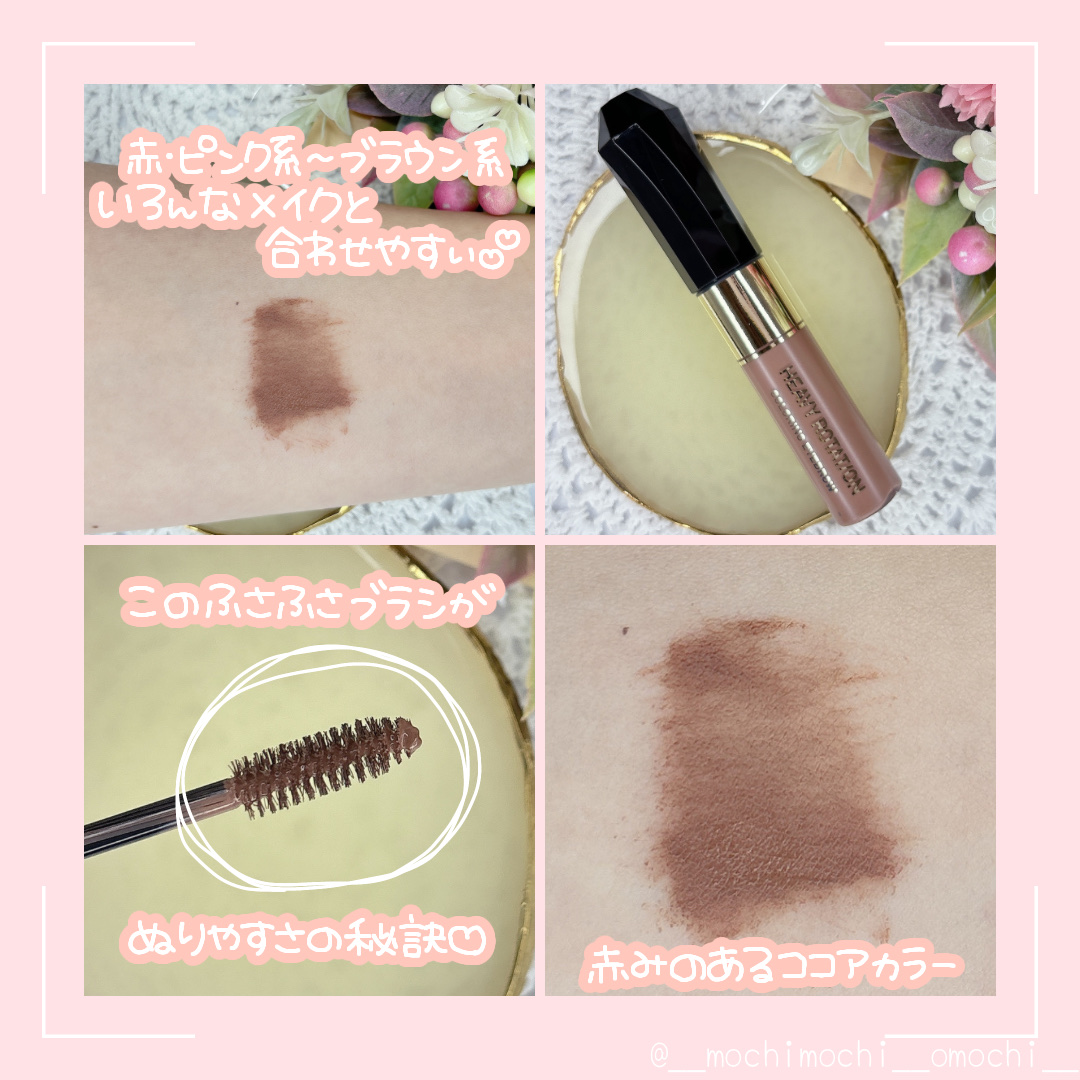 限定色とは思えないくらい使いやすい色味で、めちゃくちゃ可愛かった…! ココアブラウンの名の通り、まろやかな赤みを感じるブラウンカラーです。 そこまで明るめのカラーではないので、髪色が暗めな人でも浮かずに使えます◎ 見たまましっかり発色してくれるので、自眉の黒色に負けてしまって予想より暗い仕上がりになるということもないです。 普段もピンク〜ブラウン系の眉マスカラはよく購入するので、手持ちと被るかな?と思っていたのですが、意外と似た色の眉マスカラが無い…! 普段は、同じくヘビーローテーションのピンクアッシュを愛用しているのですが、それよりもナチュラルな色なので、購入してからは平日はずっとこれを使っています◎ ブラシはそこそこ大きめなので、ザーッと眉を撫でるだけで綺麗に付いてくれます。 本当にお気に入りのカラーになったので、ぜひ定番化して欲しい…!