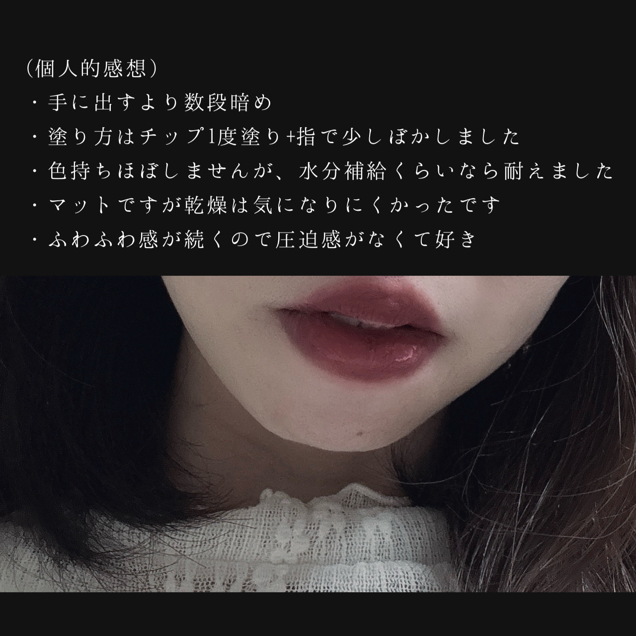 ダークなリップ欲しくて購入✨ けどちょっと私にはダークすぎて🍫食べてそのまま?って感じになってしまった😭 塗った質感はベルベットみたいなマットでとっても滑らか チップもふわふわで塗りやすいです! これは…メイクの研究して似合うようにするしかないかなぁ🥲🥲