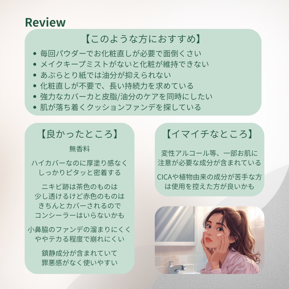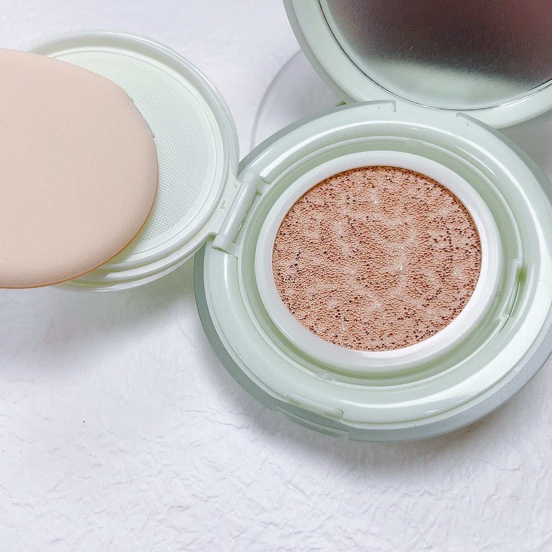 高密度パウダーなテクスチャでキレイに密着して肌悩みをしっかりカバーしてくれます。 トラブル肌でも使えるように開発されていてニキビ肌の方に使って欲しい高カバークッションです。 私は生理前後にニキビができやすいインナードライの敏感肌で普段はニキビに悩まないのですが、こちらはお肌に乗せるとちゅるっと潤う感じがあって使いやすかったです😌✨