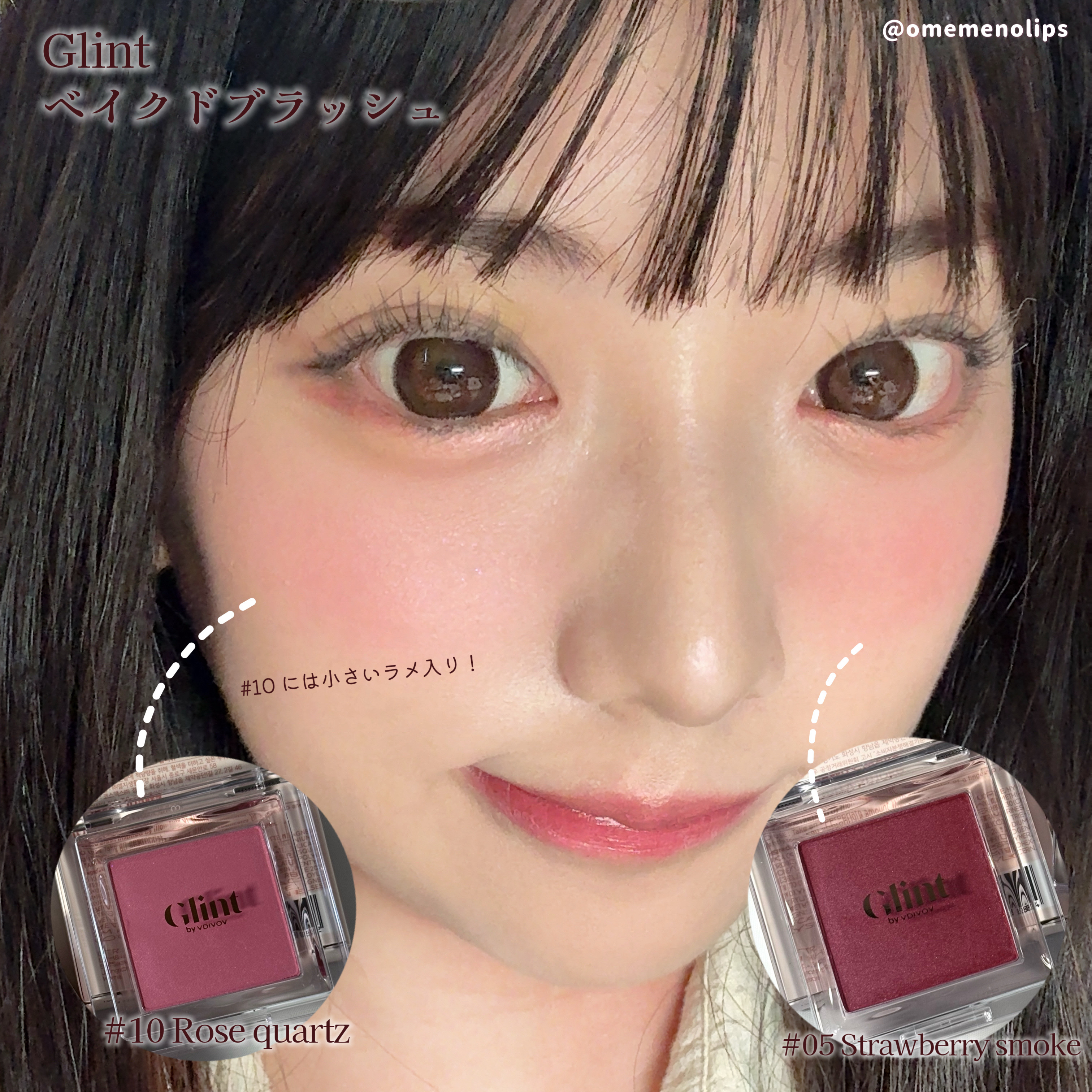 #PR【Glint-ベイクドブラッシュ】Challengers経由で購入❕〈色味〉05strawberrysmoke:赤10Rosequartz:ピンク〈ラメorマット〉05strawberrysmoke:マット10Rosequartz:ラメ入り〈密着感〉★★★★☆〈発色〉★★★★★〈感想〉◯良いところ少量でもしっかり発色するので、ちょんちょんって付けて完成するので、ヨレにくい!🙆♂️ラメ入りの方は頬がキラキラするのでハイライト効果もあり☑︎高発色だけどぼんやり付いてくれるので、写真映え⭕️×イマイチなところ高発色なため、間違えた場所に塗った場合などはごまかせないかな💦ピンクと赤の違いがそんなになかったので、私はどちらかと言うと赤い方使うかな?です!他のコスメレビューは#おめめのコスメでご覧いただけます🫧その他は@omemenolipsで🔍────────────#スクールメイク#プチプラ#韓国メイク#イエベメイク#コスメ#ブルベメイク#アイメイク#韓国jk#プチプラコスメ#コスメ紹介#アイメイク#盛れるアイメイク#100均コスメ#学生メイク