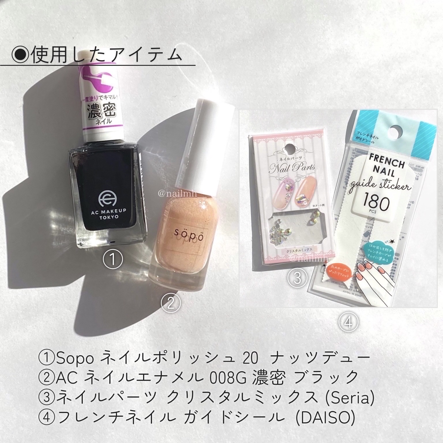𓊆平成レトロ𓊇きらきら!Y2Kラインストーンネイル🦋🖤𓈒𓈒今回はちょっぴりレトロ風なY2Kネイルをご紹介します! 平成っぽさを感じるピンク×黒の甘辛ミックスの組み合わせに 2000年代に流行ったラインストーンをあしらってレトロ可愛く仕上げてみました🪄💗 塗り方も紹介しているのでよければ是非試してみてください👌🏻̖́- ──────────────────────── 【使用したネイルポリッシュなど💅🏻】※画像4枚目参照 ①Sopoネイルポリッシュ20ナッツデュー ②ACネイルエナメル008G濃密ブラック ③ネイルパーツクリスタルミックス ④フレンチネイルガイドシール 𓂃𓂃𓂃𓂃𓂃𓂃𓂃𓂃𓂃𓂃𓂃𓂃𓂃𓂃𓂃 全体の塗り方は画像3枚目にてイラストで詳しく解説してます!🔍 画像2枚目と併せて参考にしてください! 𓈒 𓈒 【Y2Kラインストーンネイルを綺麗に仕上げるポイント】 ◉フレンチガイドシールを貼るときは、作りたいフレンチの幅より少し広めに取ること。 →今回はガイドシールを使ってフレンチを作りますが 理想の幅ぴったりに貼り塗ってシールを剥がすと、剥がした時に当初よりもフレンチの幅が狭くなってしまうことがあります😖 なのでシールを貼る際は、作りたいフレンチの幅よりも ほんの気持ち広めの幅で貼ると理想の幅になりやすいです◎ もし細かい作業が苦手ではない方であれば ②を細めの筆にとってからフレンチラインを作って塗っていくと キワの部分も含めて自分の理想の形にしやすいです! 𓈒 𓈒 「他のネイルで代用するには?🤔」 「ここが分からないから詳しく教えてほしい!」などの質問や感想、リクエストなど どんな事でもコメントいただけると嬉しいです☺️💬 いつもいいね・保存などありがとうございます! 最後まで見てくださり有難うございました❕🙌🏻 ──────────────────────── その他のネイルデザインは【#uiKaネイル】から💫 Instagram/Twitter→【@nailmh__】 𓈒 𓈒#ネイル#セルフネイル#ポリッシュネイル#冬ネイル#春ネイル#ストーンネイル#Y2Kネイル#大人ネイル#ピンクネイル#フレンチネイル#ラインストーンネイル#ニュアンスネイル#プチプラネイル#ACネイル#100均ネイル#sopo#sopo_ネイル#マフラー盛れアレンジ
