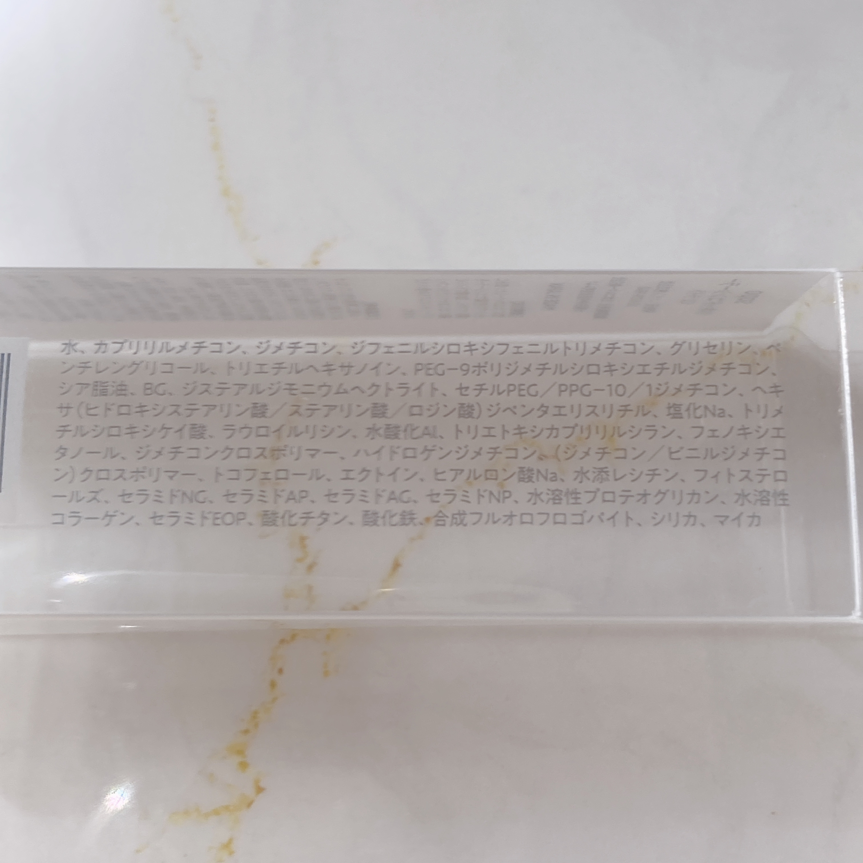 - ライト/水、カプリリルメチコン、ジメチコン、ジフェニルシロキシフェニルトリメチコン、グリセリン、ペンチレングリコール、トリエチルヘキサノイン、PEG-9ポリジメチルシロキシエチルジメチコン、シア脂油、BG、ジステアルジモニウムヘクトライト、セチルPEG/PPG-10/1ジメチコン、ヘキサ(ヒドロキシステアリン酸/ステアリン酸/ロジン酸)ジペンタエリスリチル、塩化Na、トリメチルシロキシケイ酸、ラウロイルリシン、水酸化Al、トリエトキシカプリリルシラン、フェノキシエタノール、ジメチコンクロスポリマー、ハイドロゲンジメチコン、(ジメチコン/ビニルジメチコン)クロスポリマー、トコフェロール、エクトイン、ヒアルロン酸Na、水添レシチン、フィトステロールズ、セラミドNG、セラミドAP、セラミドAG、セラミドNP、水溶性プロテオグリカン、水溶性コラーゲン、セラミドEOP、酸化チタン、酸化鉄、合成フルオロフロゴパイト、シリカ、マイカ