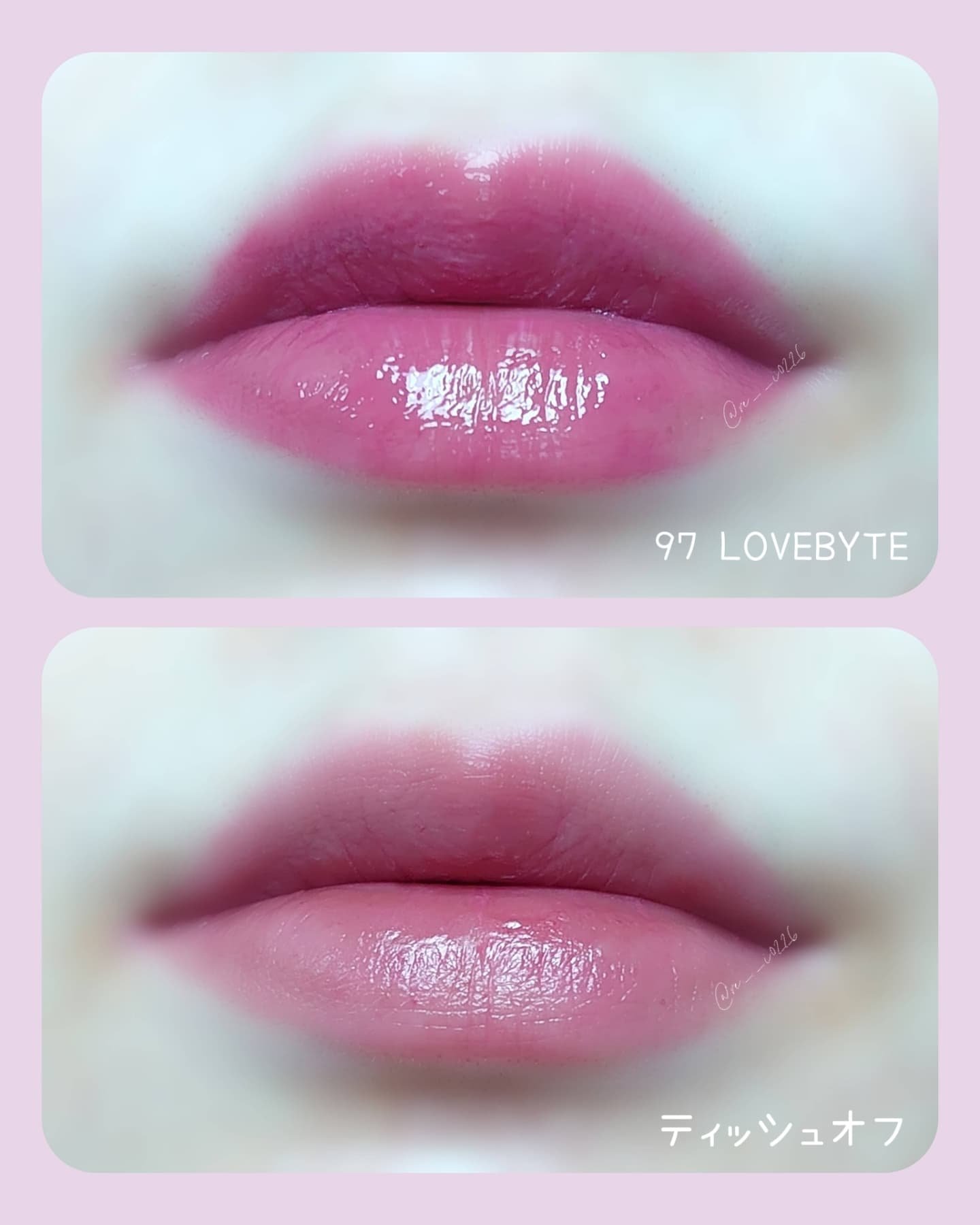 初めは明るめピンクで2枚目の色味で数分後、密着してる感じの変わった質感になり色が濃くなってる感じでした! 密着感があってツヤリップは初めてだったので新感覚のリップだと思いました💕 色も97番が使いやすくて毎日メイクにおすすめなカラーでした!!✨