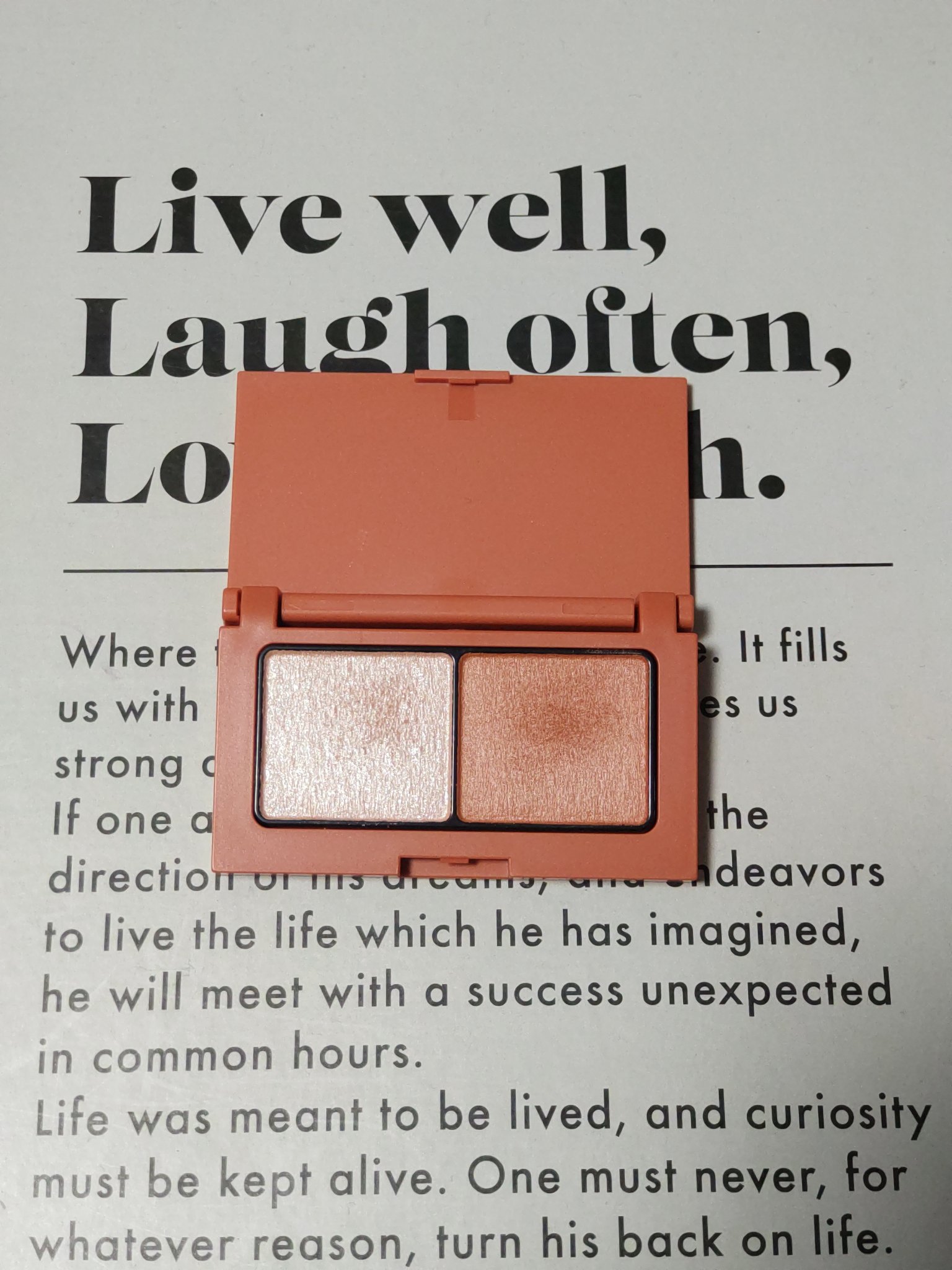 普段あまり使用しないオレンジ色のアイシャドウ。 鮮やかすぎない色味がブラウンっぽくも見え ブルベも使えそうな仕上がりになりました! そして気になる粉質。さらさらのふわふわです😌💕 左側のハイライトカラーは涙袋にもぴったり。ギラギラせず、ちょうどいいラメ感です。 ただ、2色なので締め色がないとしっくりこない方は少し物足りないかもしれません。 私は締め色があった方が馴染むので、このパレットにダークブラウンのシャドウを足しています。 2色で仕上げると抜け感が出ます。締め色がなくても大丈夫な方はぜひ2色で🧸