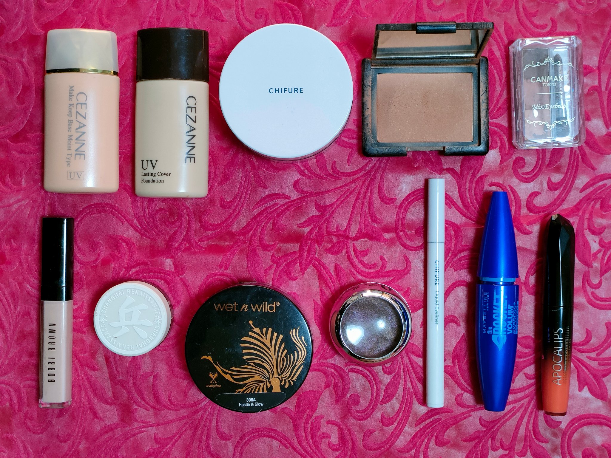 化粧下地CEZANNE 皮脂テカリ防止下地 保湿タイプ オレンジベージュ顔全体に。 ファンデーションCEZANNE ラスティングカバーファンデーション 20 自然なオークル系顔全体に。 チークNARS ブラッシュ濃いめに。 アイブロウキャンメイク ミックスアイブロウ 09 ピーチティーブラウンしっかり眉に。 アイシャドウクリーム和粧 象棋アイシャドウ #A07 兵涙袋に。 アイシャドウwet 'n' wild MegaGlo Loose Highlighting Powder上まぶた全体に。 締め色アイシャドウToo Faced チョコレート ギャラクシー グラム コレクション二重幅に。 アイライナーちふれ リキッド アイライナー 筆ペンタイプ BK30 ブラック目尻に。 マスカラMAYBELLINE NEW YORK ボリューム エクスプレス ロケットバサバサまつ毛に。 リップYVES SAINT LAURENT BEAUTE ルージュ ヴォリュプテ シャイン 32 ピンクインディペンデント唇全体に。