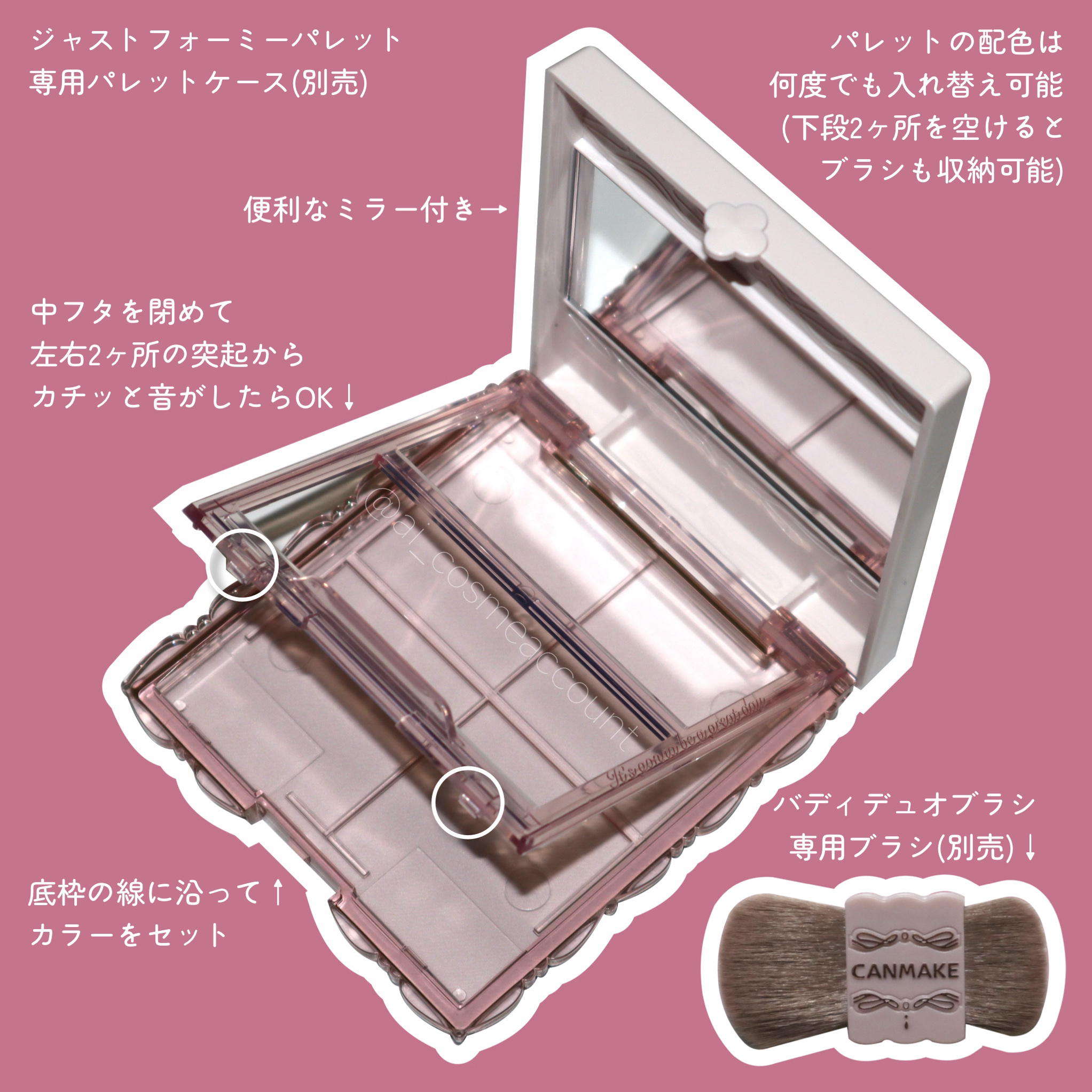 ジャストフォーミーパレット かなり軽いですが丈夫な作りで鏡も付いています。 日本のプチプラコスメでは珍しいブルー系の偏光カラーが出たのが個人的に嬉しいです。 濃いめに見えて発色は柔らかいので調整しやすく、失敗しにくいです。