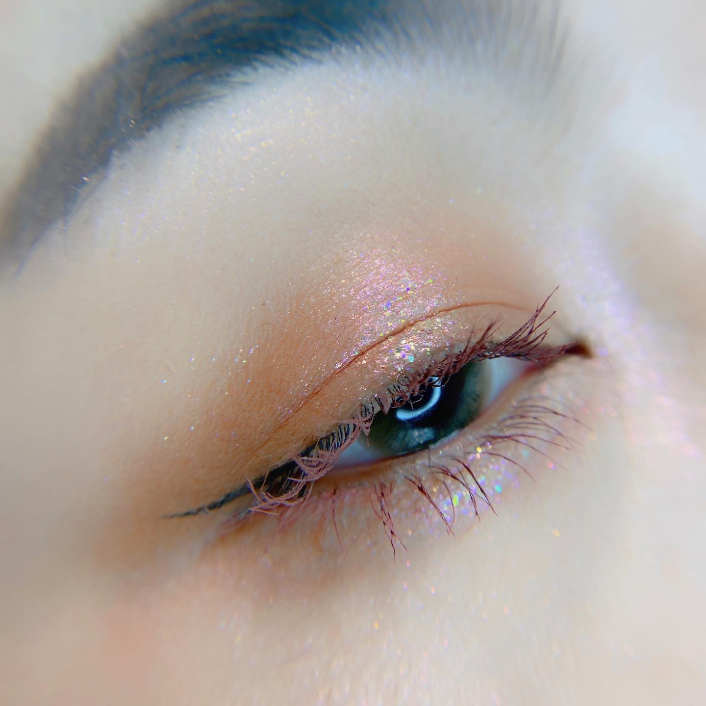 濡れツヤ感がたまらない🥺 ブラウンで締めることでグリッターだけよりも落ち着いた印象に◎ ライン、マスカラはブラックでしっかり締めて グリッター際立つメイクに! 目元全体に、アイホール真ん中縦に重ねる 二重幅から三角ゾーンに。目尻に濃いめにのせる