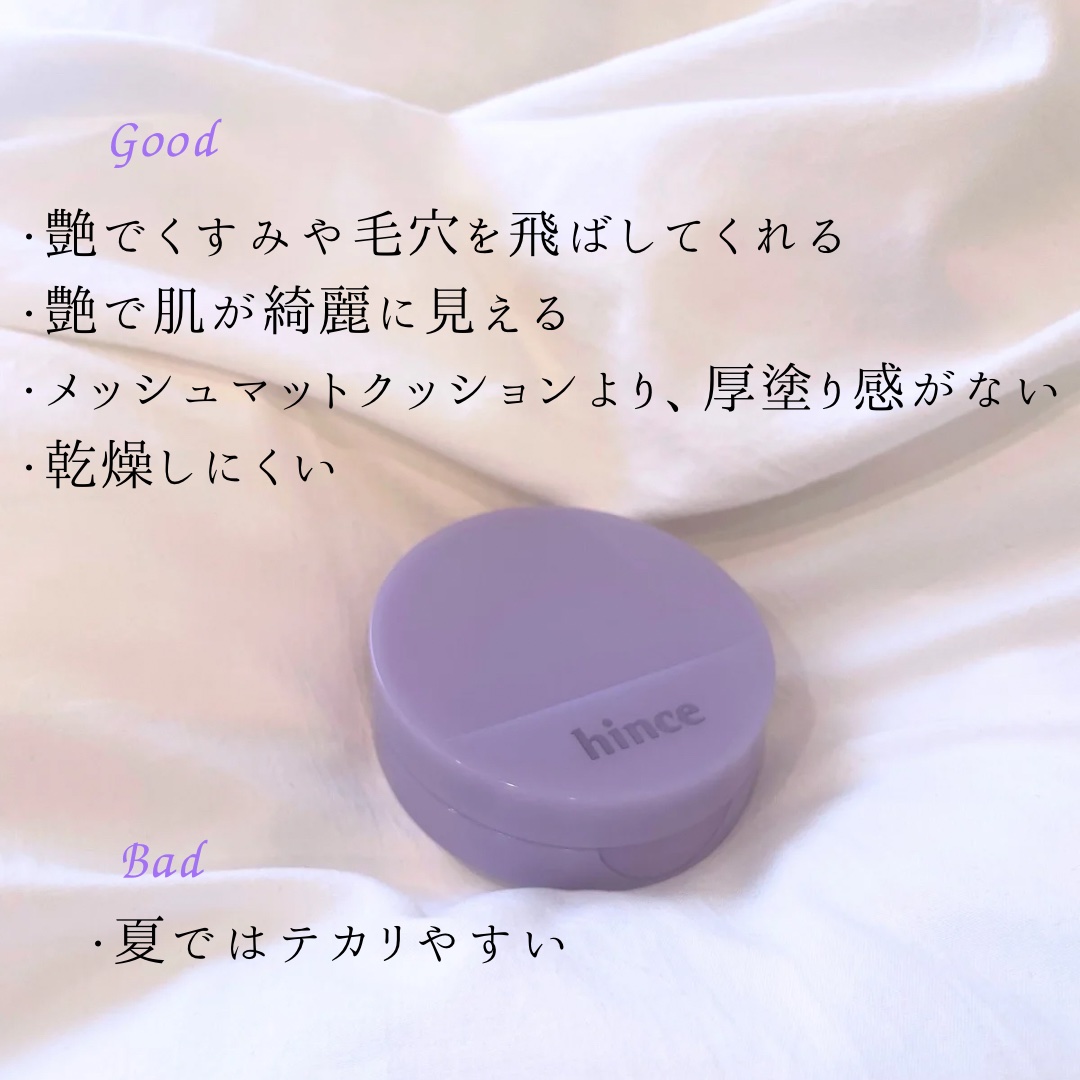 hinceセカンドスキングロウクッション<21アイボリー>☑︎︎SPF50+PA++++☑︎︎︎︎︎︎︎ヴィーガン認証☑︎︎︎︎︎︎︎低刺激認証☑︎︎︎︎︎︎︎48時間持続力&アンチダークニング☑︎︎︎︎︎︎︎艶めきのある真珠艶肌☑︎︎︎︎︎︎︎ナチュラルカバー☑︎︎︎︎︎︎︎インフューズドテクスチャーテクスチャ-★★★★★カバー力★☆☆☆☆ツヤ感★★★★☆馴染み★★★★☆保湿★★★☆☆コスパ★★★★☆【テクスチャー】みずみずしくて軽いウォータリー質感塗布して時間を置いてもペタペタ感が残るので目周りや口周りはパウダーをした方が持ちが良かったです。【カラー】クッションで見た時は黄みを強く感じましたが、実際塗布すると結構白めで黄色にもピンクにも寄っていませんでした。普段使用しているカラー・TIRTIR(赤)…21・ミシャ…23・アピュー…21・フィットミー…112・shuuemura…574【補正力】薄づきでホクロ、シミ、クマなどはうっすらカバー色ムラ・毛穴補正力はあり◎【保湿】同ラインのプライマーとプリマヴィスタのパウダーでセットしたとこ、シワに溜まったり乾燥で崩れた感覚はなく長時間ツヤ肌をキープしてくれたので保湿力◎hinceのファンデは今回初めて使いましたが厚塗り感のないナチュラルなツヤ肌を叶えてくれて好みでした✨#目指せ毛穴レス肌#至高のツヤ肌レシピ#春の紫外線対策