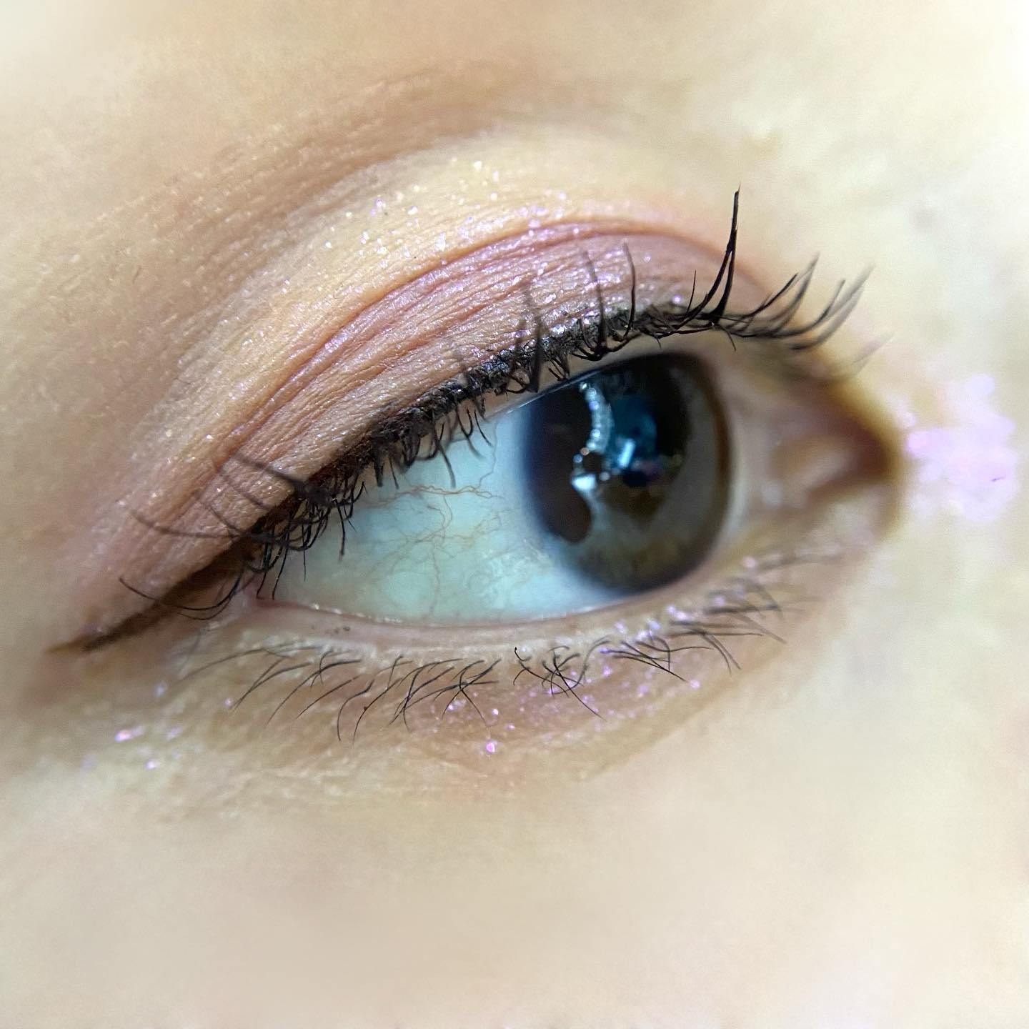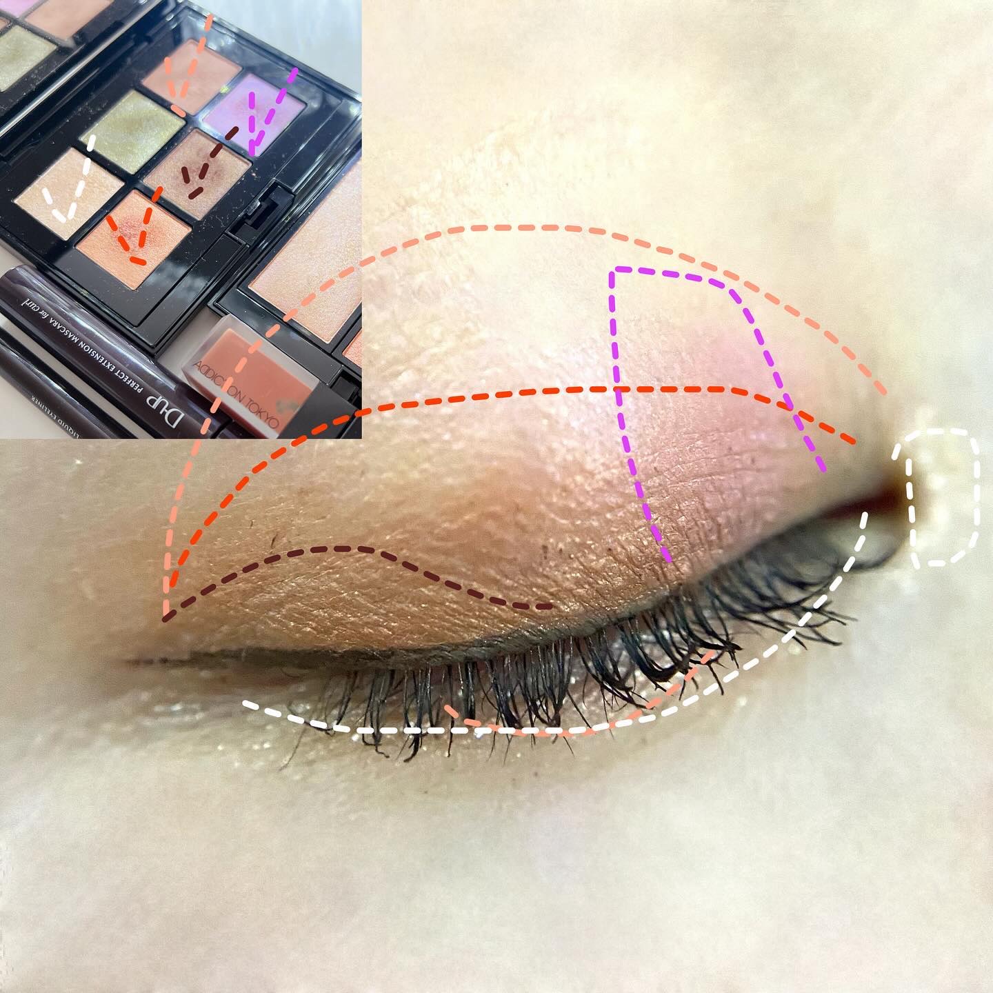 この2色は相性が良いので縦割りっぽくしました。 ピンクライラックは黒目上に来るようにすると、入れている面積は狭くても、印象は強くなります。 オレンジの上にライラックを重ねましたが、色が混ざらなくて驚きました。 アイボリーベージュのラメを下瞼に入れると、ラメの雨が降ったような印象に。 口元はホリデー113S Dusty Ginger柿オレンジ。可愛いし目元にも良く合いました。