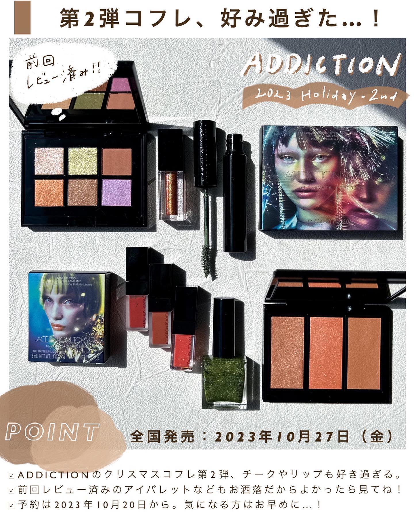 #秋冬メイク20232023クリスマス速報!!〜ADDICTION第二弾、やばいのよ🍊編〜さて前回に引き続きアディクションのホリデーコレクション第二弾について語らせてもらおうかなと思っております✍️「UNKNOWNFAMILIAR」がテーマの第二弾コレクションは、フォトグラファーのエリザヴェータ・ポロディーナ氏(ELIZAVETAPORODINA)とコラボレーションしたというスタイリッシュなパッケージが目印。魔法のようなきらめきとカラーで「今」を最大限謳歌したくなるようなアイテムが豊富に登場するわけですが🫶前回はアイメイク系にフォーカスしてレビューしたんだけど、今日はその他アイテムをば。その他ってまとめてしまうと雑な感じがするかもだけど、全くそんなことはなく、今回のやつも100点満点の可愛さなのでぜひご期待あれ(誰)▼ホリデーアディクションブラッシュパレットアンノウンファミリア102NoWayOut数量限定2色 各7,480円┈┈┈┈┈┈┈┈┈┈┈えっと、これ私のフォロワーさん好きな方多いんじゃない?!?!🍊✔︎パールの煌めきでニュアンスチェンジやうる艶感をプラスできるトップコート的な『ニュアンサー(N)』✔︎パールの繊細な煌めきで上質なツヤと透明感を纏わせる『パール(P)』✔︎しっとりと溶け込むようになじみつつ、柔らかで自然な陰影をつくりあげる『マット(M)』3種類の異なる質感をセットしたスペシャルなチークパレット。この102はオレンジ系のカラーをぎゅっと詰め込んだヘルシーな色合いでもう大好物過ぎました、、、!左から順に宝石のように輝くシアーベージュのニュアンサー(これまじで可愛い)、ヘルシーな表情に導いてくれる鮮やかなオレンジパール、そしてモダンでお洒落感のあるウッディなマットベージュ!!!こんなんどう使っても、そしてどれを使っても可愛いに決まってる!!!!🍊こういうヘルシーなオレンジ系大好きな方にはドンピシャだと思います!ヘビロテ確定!!ミニリップトリオアンノウンファミリア102OtherSide数量限定2色 各4,950円┈┈┈┈┈┈┈┈┈┈┈そしてこちらのミニリップキットも注目度高そうだなーと思っております。ちゅるんとした質感が可愛いリップオイルや、軽やかな質感でシアーなマットタイプのリップ、そしてふんわりと柔らかなマットタイプのリップ、それぞれのミニサイズがついてくるお得キットです。リップってさ、なかなか使い切らなくないです?それにその時の気分やトレンドによって、当時は気に入って使っていたけど少し時間が経ったらやっぱりしっくりこないかも…みたいになりませんか?わたしだけだろうか。それからわたしはポーチの中にリップは何本か入れたい派なんだけど(唇乾燥してるからこのグロス重ねちゃお、とか、疲れ顔に見えてきたから明るい色をプラスしよ、みたいな)、少しでも荷物を減らすためにミニリップはかなり重宝する。ので、このキットはいろんなテクスチャーを楽しめるし、手軽なサイズだし、価格的にも3色試せると思えばお手頃だと思うし、アディクションのリップ気になるわーって方に本当おすすめです。ちなみにこの102というカラーはこれまた大好物なオレンジベージュ系。チークとリンクさせたらはちゃめちゃに可愛いです🍊✔︎ザネイルポリッシュ+アンノウンファミリア104SPMyInstinct数量限定5色 各2,420円┈┈┈┈┈┈┈┈┈┈┈そして人気のネイルからもホリデー限定色が登場、どれもキラキラのパール入りで爪先から華やかに彩ってくれます、、、!104はなんとも言えないお洒落な透け感モスグリーンにゴールドパールが煌めくクリスマスらしいカラー。これは手元だけじゃなく、フットにも映えそうです💚🏃♀️いかがでしたでしょうか!!!!発売日:2023年10月27日(金)予約は本日10月20日から解禁です!!オレンジ好きとしては第二弾コレクションが激アツ&ドンピシャ好みすぎたのよ〜〜🍊特に推しはチークパレットと前回レビューしたアイシャドウパレット。実物の煌めきにキュンとしちゃうこと間違いなし!!って太鼓判押しちゃう🥁✨ついうっかりスウォッチしたら欲しくなっちゃうくらい可愛いので!ぜひカウンターでチェックしてみてくだされ〜〜┈┈┈┈┈┈┈┈┈┈┈┈┈┈┈┈┈🕊まりか@mk_____ch元アパレル勤務のアラサーOLがトレンドコスメや垢抜けメイクを発信中#おえかきコスメ#コスメ好きさんと繋がりたい#コスメレビュー#コスメ#新作コスメ#デパコス#ホリデー限定#アイシャドウ#チーク#フェイスカラー#リップ#限定コスメ#ADDICTION#アディクション#クリスマスコフレgiftedby@addictionbeauty_official#秋冬メイク2023