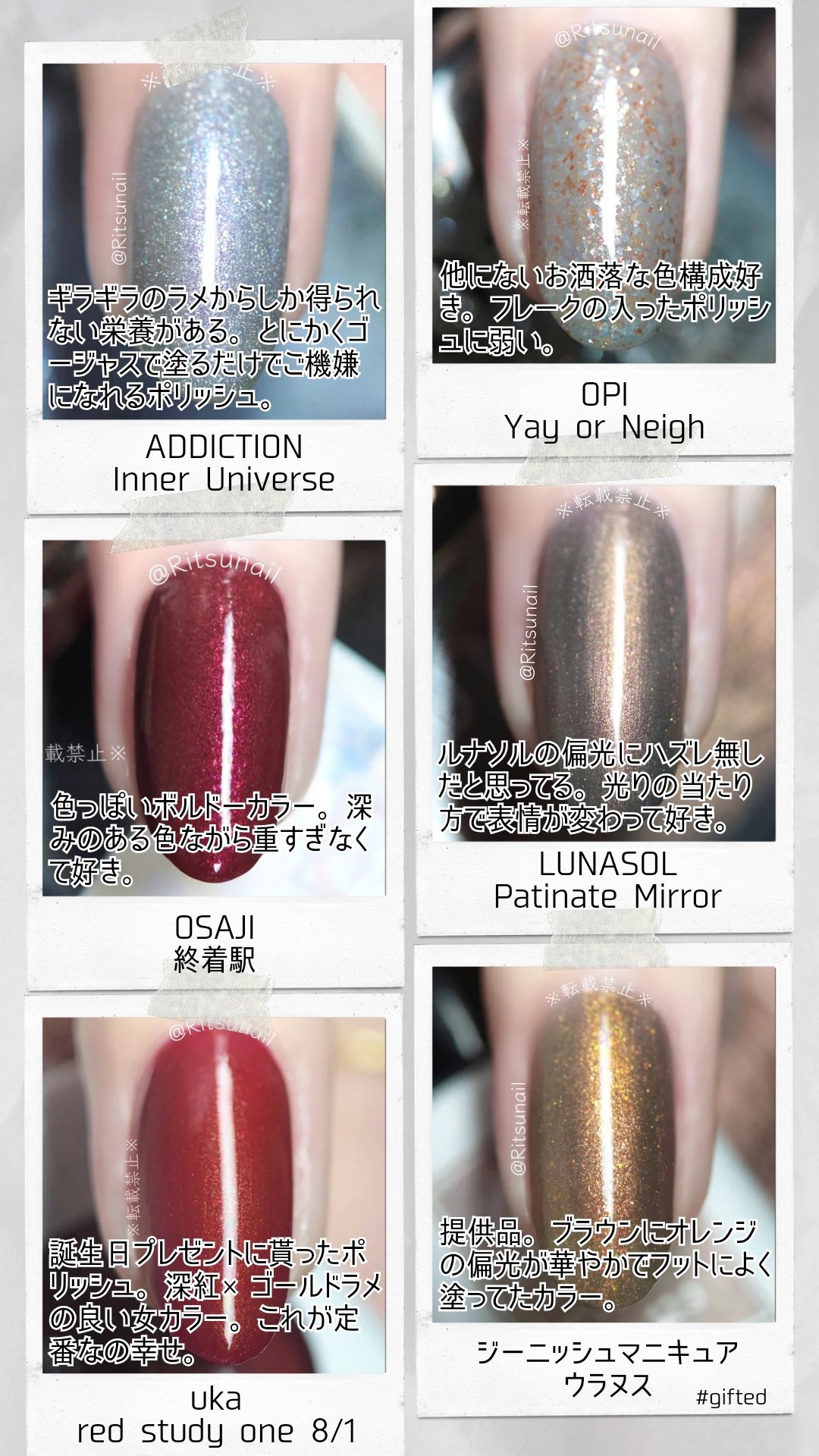 2023年下期ベストポリッシュ。面倒でX(旧Twitter)に載せていた画像から引用したのでクレジットに@Ritsunailが入っていますが@Ritsunailは私のXアカウントになります。どれも大好きなポリッシュですが、下期で1本だけ選ぶとしたらADDICTIONのinneruniverseかと思います。どれも素敵な色でした!