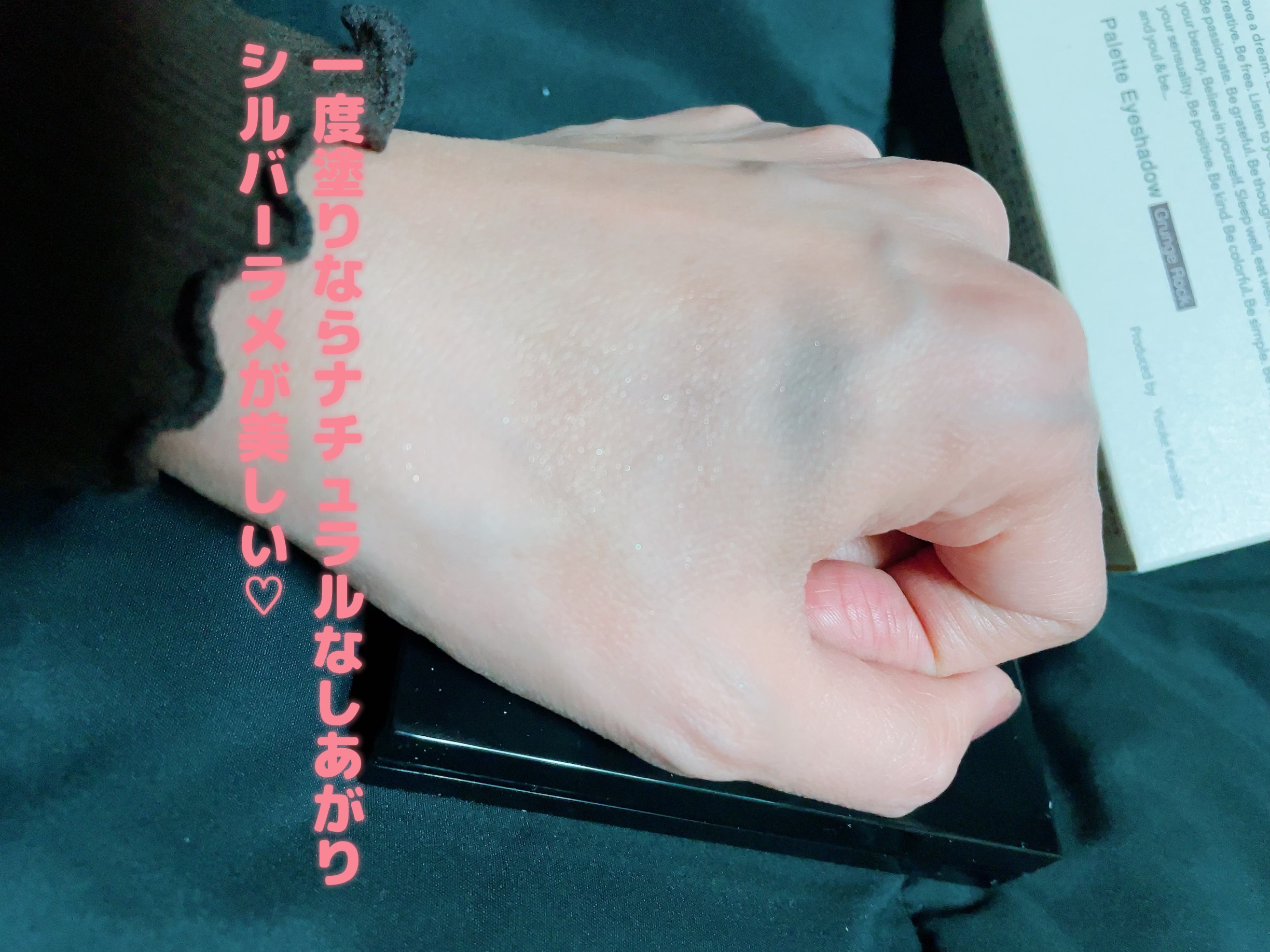 アンドビーのアイシャドウパレットは何個か持ってますがこのパレットの圧。圧が凄くいい 色が濃いんですよね。4色とも。 ちなみに黒は案外シアーで調節しやすい発色。右2色はさらっとしてるのに対して左2色はしっとりとしていて見たまま発色します。 グラムロックを買ったまま寝かせているのでそろそろ使いたいなーーー
