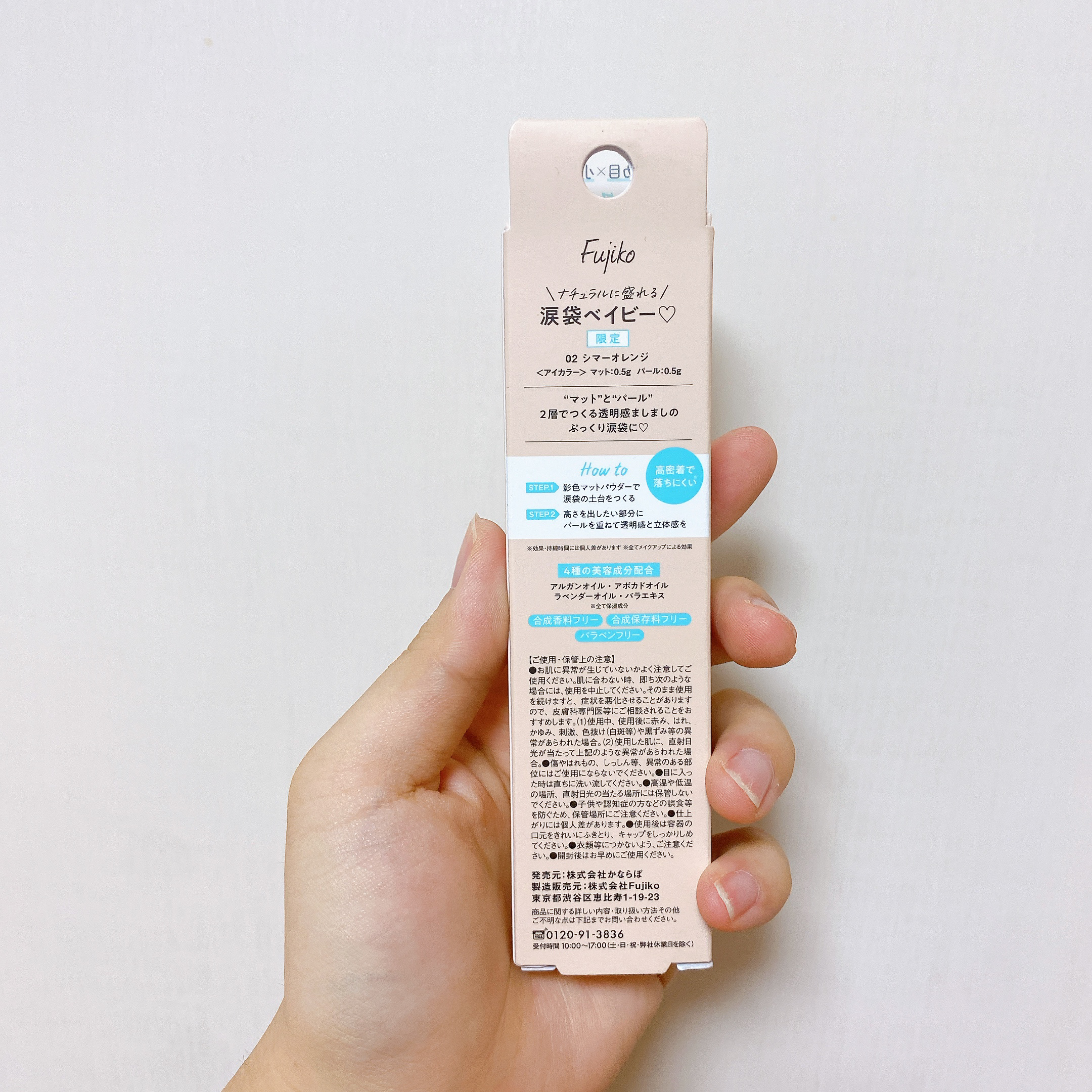 マットで影色をつけて土台を作ったらパールを重ねて涙袋のふくらみをつくるよ。 形状も少し変わっていてパウダーをぎゅっと固めたようなものがキャップの中に入っていてかしゃしゃっとしながらチップに適量とるよ。 まさに"影"な色を使うことが多かったので涙袋ベイビーのマットは淡くて肌なじみのいい色味でびっくり! シマーピンクがブルベカラーでシマーオレンジがイエベカラーになっていて、それぞれPCにあうものを使うとすごく自然になじむ。 反対のカラーを使うと存在感が増した仕上がりになるよ。 私はシマーオレンジを使った時の方がより立体感が出た気がしました。 テクニックなしとにかく簡単だからポーチに入れておけば急なお出かけの時もささっと塗るだけで完成。 ヨレにくいしクマみたいにならないのもうれしい! 涙袋ない人もある人も一度使ってみて欲しいお気に入りのアイテムです♡