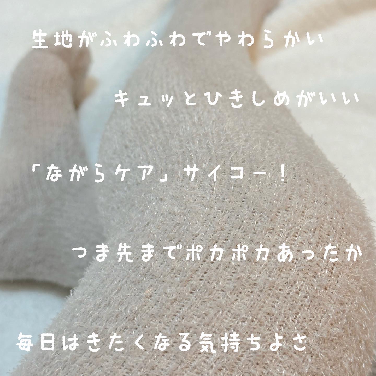 ふわふわの柔らかい素材で、触り心地、肌触りが抜群👍 肌ケア成分のCICAも配合されていて、ふわっと発熱素材なんです✨ 最近寒くて、足元が冷たくなる日があったんですが、これを履いて寝るようになってから、あったかくて気持ちがよく眠れてます💤 伸縮性抜群で、キツさもあまり感じないけど、圧着はしっかり。 冬の夜は、コレがあればあったかくケア出来て癒されるので、特に冷え性の方にオススメですよ❣️