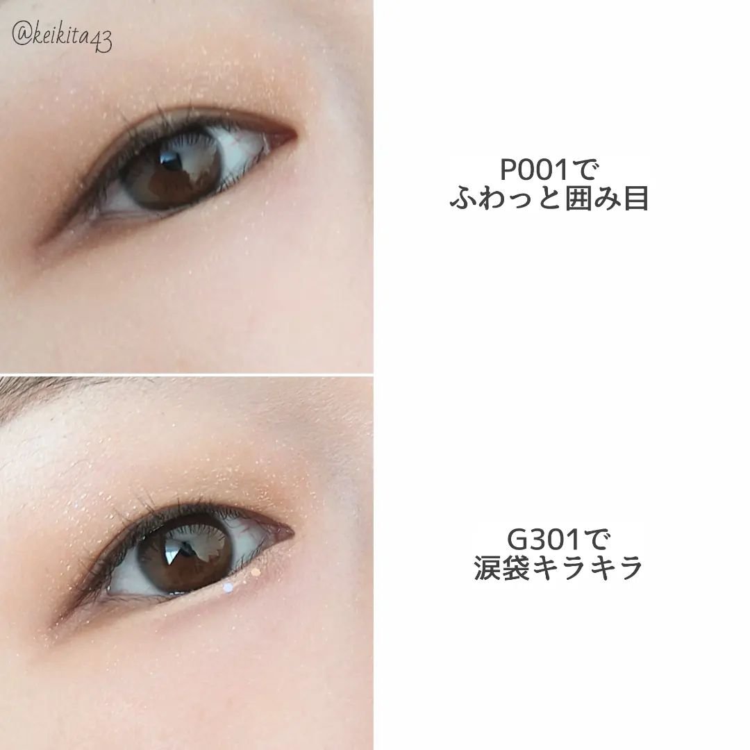 P 001:ナッティーラテは、透け感あるライトブラウンでぼかした時の色味が秋にぴったりでめちゃ好きな色。 しっかり色づくのも気に入ったよ♡ G 301:ノエルビジュー(数量限定)は控えめ発色で大き目ラメがキラリと輝いて可愛い。 ラメが大き目だけど、上品なの。 ✔️まぶたにフィットするななめチップ✔️発色が長持ちする✔️二重ラインにたまりにくい