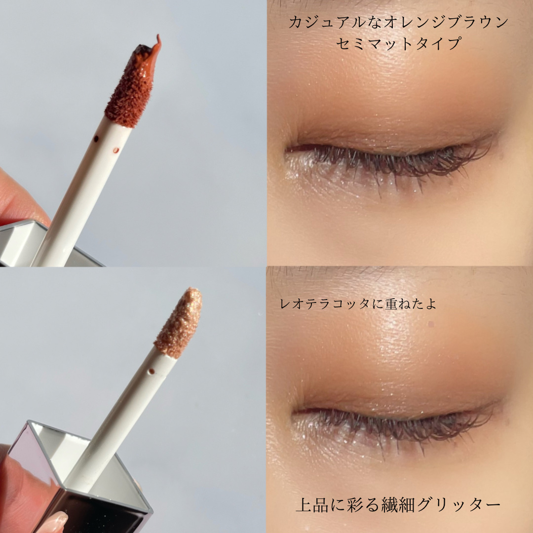 まずパケがオシャレで高級感もあって素敵だと思いました😍 レオテラコッタは、セミマットでカジュアルなオレンジブラウン🧡 ノエルビジューは、グリッタータイプでピュアを引き出すペールベージュです✨ 使ってみると、リキッドだし密着しやすいなぁと感じました。発色もよかった◎ 持ちも良く感じました! 上まぶたにはレオテラコッタを、涙袋にはノエルビジューを塗ってみました☺️ 可愛く仕上がって満足です(*^^*)