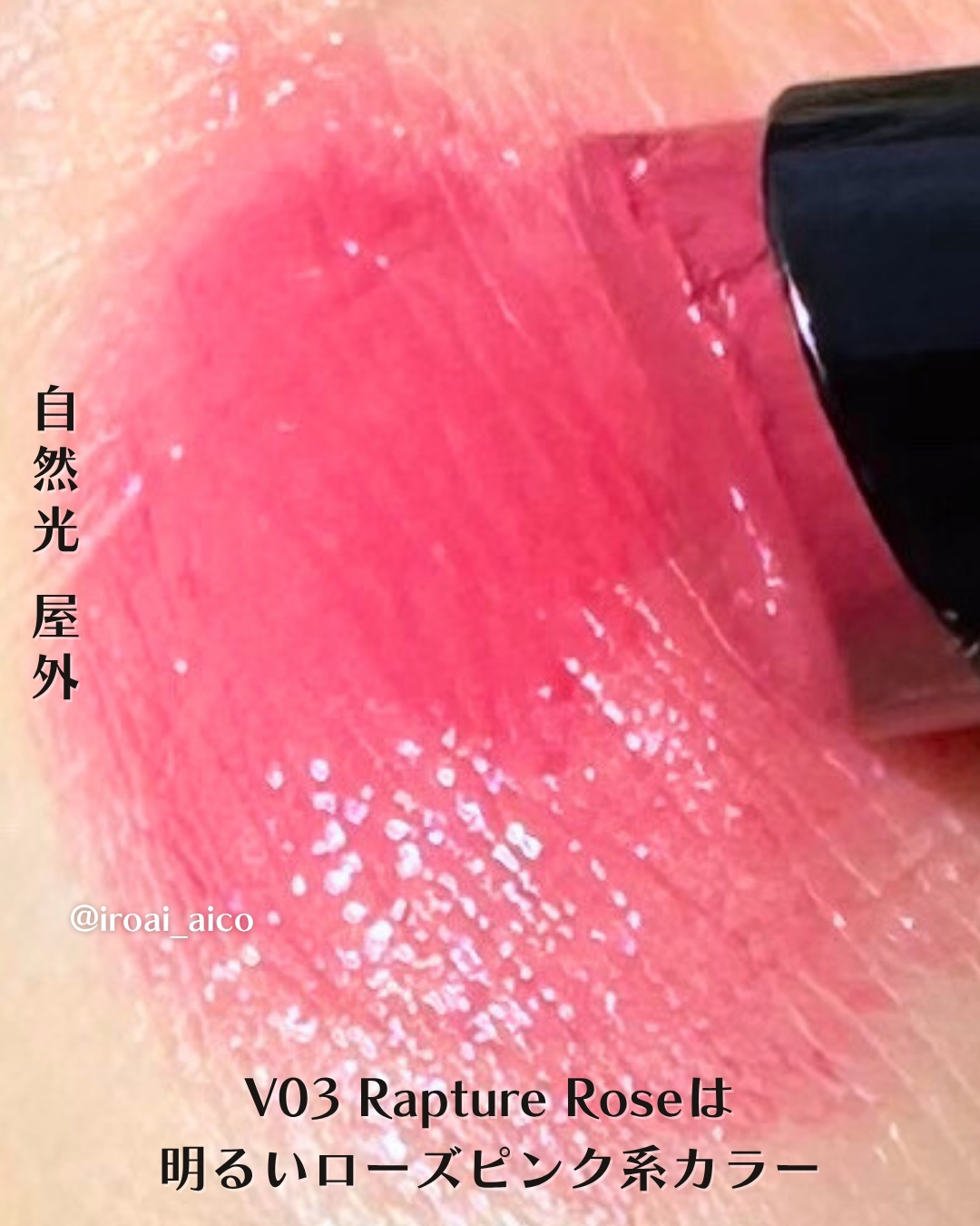 明るさが欲しくてV03を購入。 見たまま発色してくれるのでオンラインでも購入しやすいと思いました。 明るさのあるローズピンク。 パキッとした色味ではないので上品な仕上がりになります。 潤い感があるといってもグロスのような潤った感じではなく唇にハリがでるようなもっちりして滑らかな質感になります。