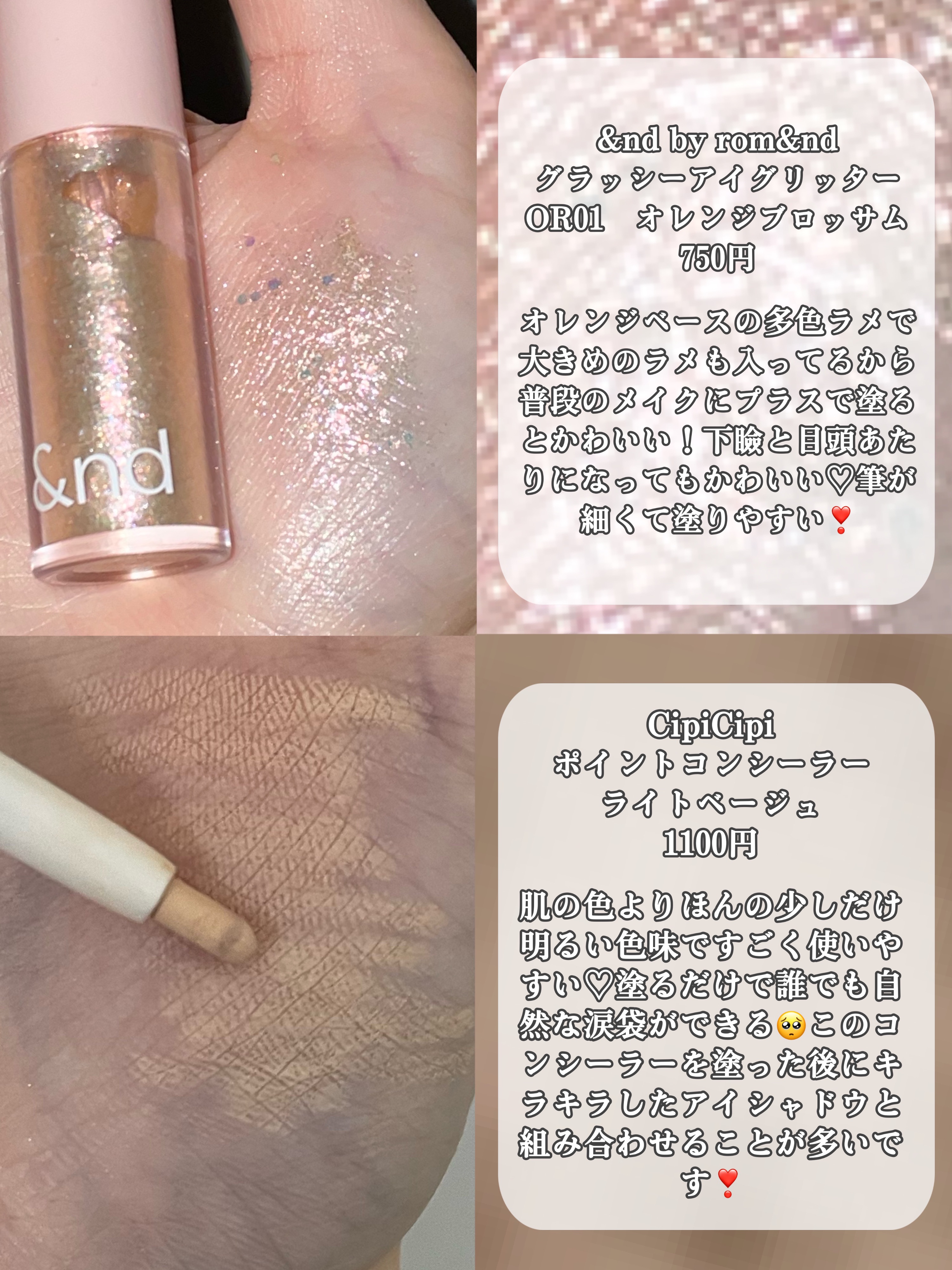 【1900円以内のプチプラコスメ】暖色系の相性の良いコスメを集めました👀✼••┈┈••✼••┈┈••✼••┈┈••✼••┈┈••✼KATEザアイカラー005ゴールド 715円キラキラのゴールドラメがかわいい♡控えめなグリッターとしても使えるし繊細なパールが目立ちすぎないから上瞼全体に塗ってもかわいい!✼••┈┈••✼••┈┈••✼••┈┈••✼••┈┈••✼KATEザアイカラー011オレンジベージュ715円涙袋メイクに使える♡オレンジベージュだけどオレンジが強すぎなくて肌に馴染むからこれ一つでも自然な涙袋ができて使いやすいカラーです!✼••┈┈••✼••┈┈••✼••┈┈••✼••┈┈••✼innisfreeマイアイシャドウマット#9 803円オレンジにホワイトをいっぱい混ぜた感じ🤔チークとして使うと自然な血色感が出てすごくかわいい♡さらさらしたアイシャドウで、白湯メイクにも使える!✼••┈┈••✼••┈┈••✼••┈┈••✼••┈┈••✼和粧麻雀アイシャドウキクパール660円 完全パケ買いだったけどキラキラしたゴールドアイシャドウですごくかわいい♡全体に使うより上瞼の中心や涙袋の中心に使うことが多いかな〜✼••┈┈••✼••┈┈••✼••┈┈••✼••┈┈••✼&ndbyrom&ndグラッシーアイグリッターOR01 オレンジブロッサム750円 オレンジベースの多色ラメで大きめのラメも入ってるから普段のメイクにプラスで塗るとかわいい!下瞼と目頭あたりになってもかわいい♡筆が細くて塗りやすい❣️✼••┈┈••✼••┈┈••✼••┈┈••✼••┈┈••✼CipiCipiポイントコンシーラーライトベージュ1100円肌の色よりほんの少しだけ明るい色味ですごく使いやすい♡塗るだけで誰でも自然な涙袋ができる🥺このコンシーラーを塗った後にキラキラしたアイシャドウと組み合わせることが多いです❣️✼••┈┈••✼••┈┈••✼••┈┈••✼••┈┈••✼KIREIFACTORYラッシュ&アイブロウマスカラ01 ロイヤルベージュ880円色味が本当に天使だった👼アイブロウとして使うと眉毛脱色したみたいな垢抜け眉になってすごく使いやすかった♡まつ毛に使う場合は髪色明るい方がいいかも!✼••┈┈••✼••┈┈••✼••┈┈••✼••┈┈••✼ettusaisエテュセアイエディションマスカラベースウォームスタイル02モカブラウン1650円繊維がたくさん入ったブラウンのマスカラベース♡明るすぎずの落ち着いた色味で、繊維のおかげでまつ毛は長くなるけど派手すぎずの絶妙さが好き♡✼••┈┈••✼••┈┈••✼••┈┈••✼••┈┈••✼ZEESEAエンジェルキューピッドキスハイライターS02 ダイヤモンドシャンパン 1848円完全パケ買いコスメ♡買ってから時間が経つのでだいぶ傷ついてる。。肌に馴染みやすいゴールドハイライトで自然だけど確実に存在感が出てかわいい。✼••┈┈••✼••┈┈••✼••┈┈••✼••┈┈••✼キャンメイクハイライターN01 シルキーベージュ605円個人的に1番使うハイライト♡どんなメイクにも合うしナチュラルに仕上がるからとってもおすすめ。プチプラだし一つ持ってても損はない!✼••┈┈••✼••┈┈••✼••┈┈••✼••┈┈••✼melottemelotte1dayヒロインルールDIA:14.2mm着色直径:13.5mm1793円裸眼より確実に盛れるのに色味が明るすぎないブラウンでフチもないから使いやすいし1番好きなモテカラコン♡薄めのメイクでもかわいい。参考になったら嬉しいです👀#ナチュラルメイク#ナチュラルカラコンなちゅらる#白湯メイク#ゴールド_アイシャドウ#ゴールドラメ#イエベメイク#ハイライトプチプラ#ハイライト#プチプラコスメ