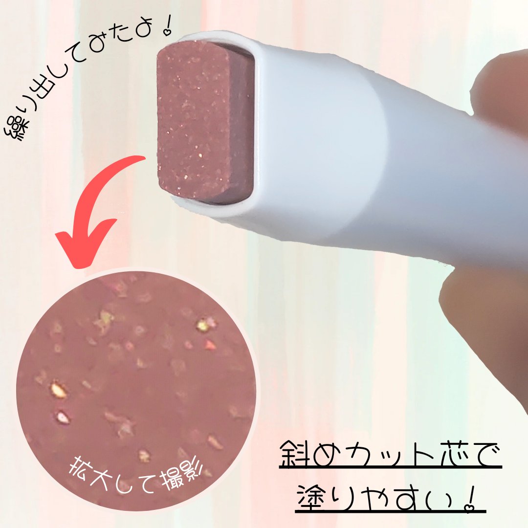 容器はシンプルなデザインで キャップは引っ張って開けるタイプ。 容器の下部分をクルクルと回して繰り出した芯は 斜めカットになっているので 直接まぶたに塗りやすいのが◎ 今回は03 モーブフィグというカラーを使用しましたが シアーな発色+ラメは控えめに輝く感じが可愛くて 普段使いもしやすいかなと感じられて良かったので これからも使っていきたいなと思います✨